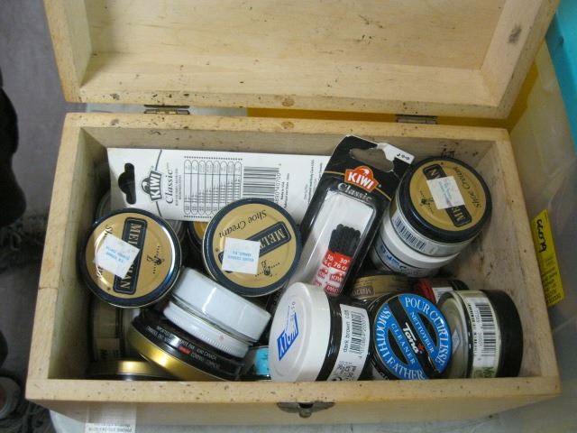 BOX OF ASSORTED SHOE POLISHES CLEANERS ETC