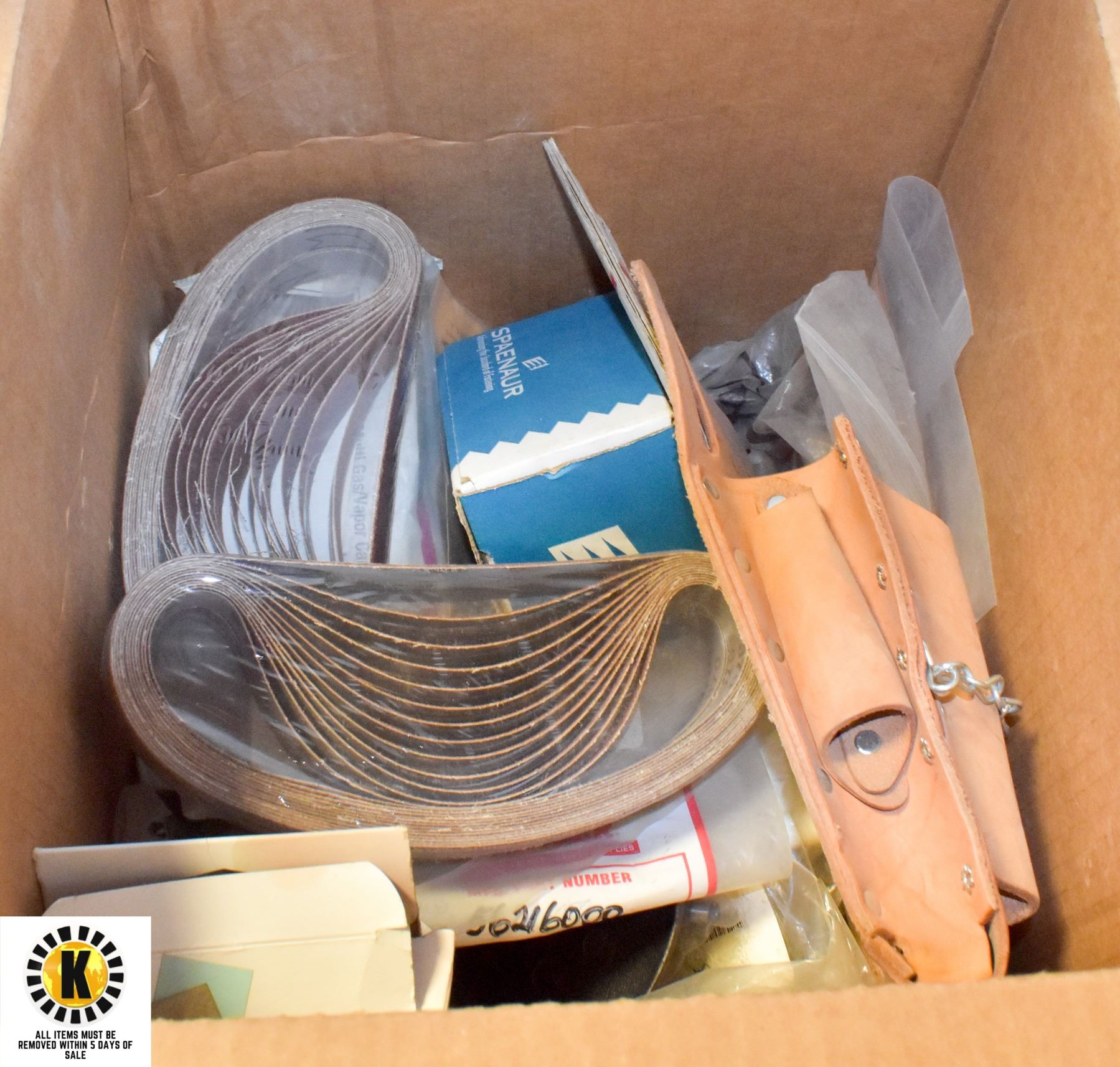BOX OF ASSORTED SHOP SUPPLIES, INCLUDES AIR TOOL