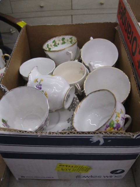 BOX OF ASSORTED TEA CUPS & SAUCERS