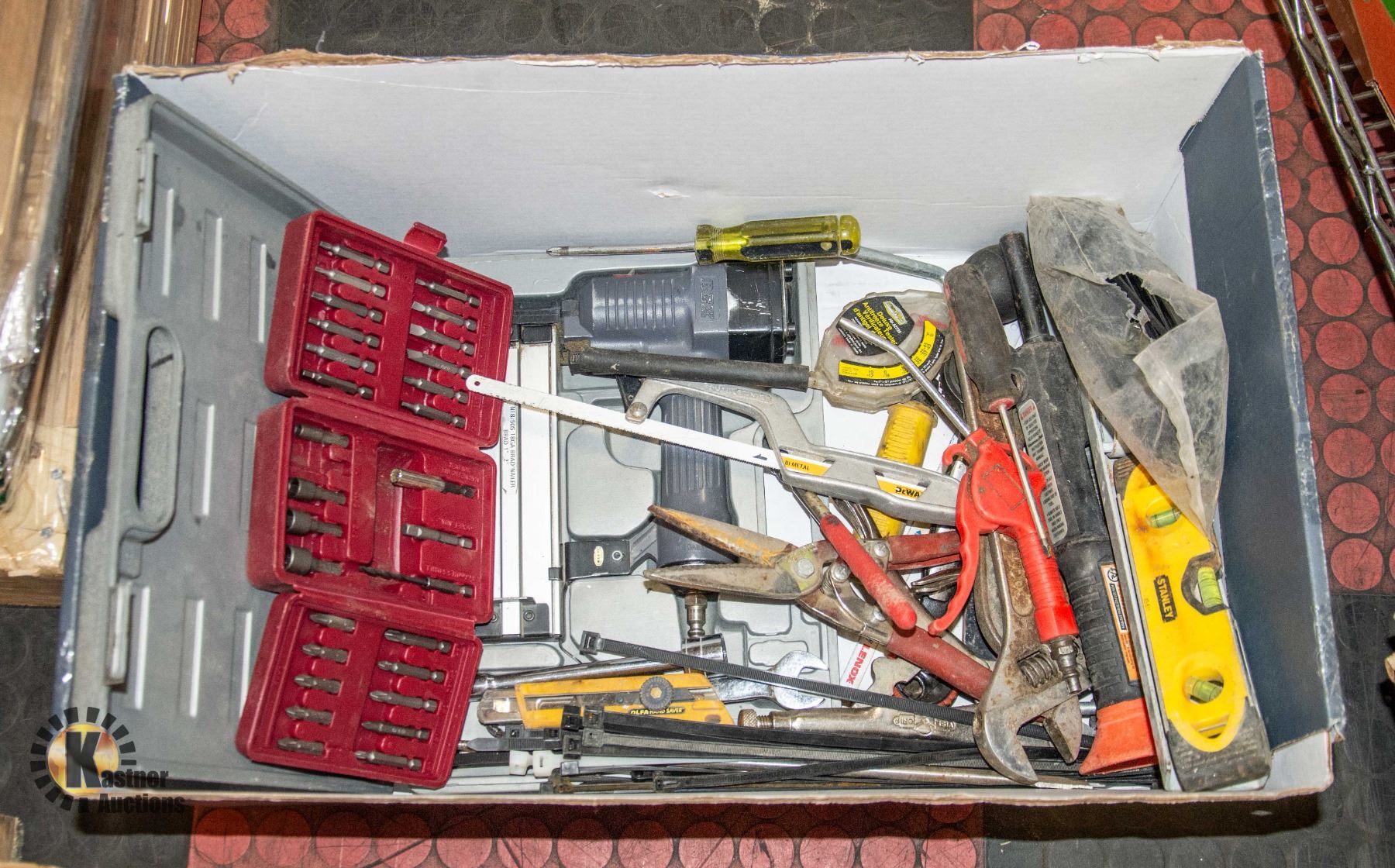 BOX OF ASSORTED TOOLS, ACCESSORIES + MORE