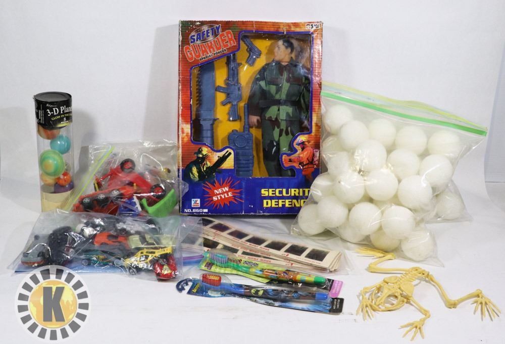 BOX OF ASSORTED TOYS- TOY CARS, TRACTORS, SOLDIER