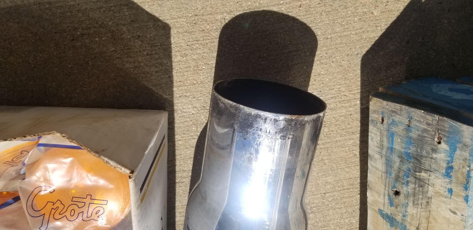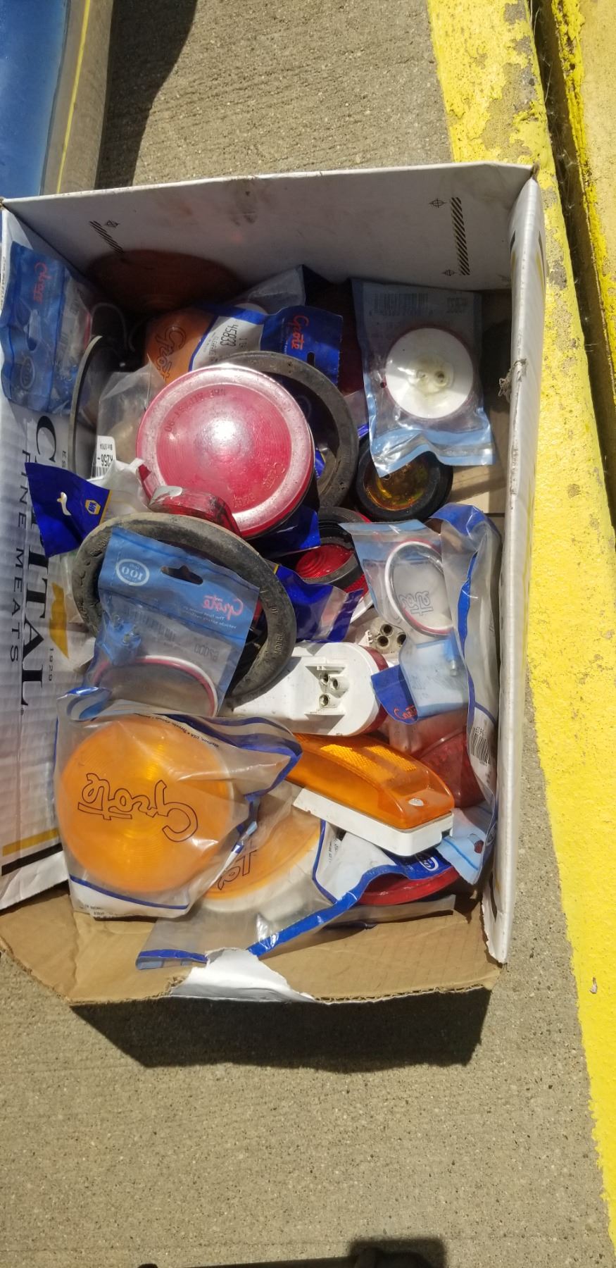 BOX OF ASSORTED TRAILER LIGHTS AND 5" EXHAUST STACK