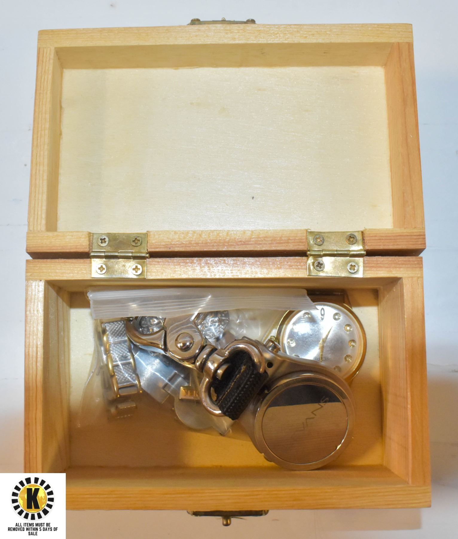 BOX OF ASSORTED WATCH PARTS; VERSACE LINKS, EVANS