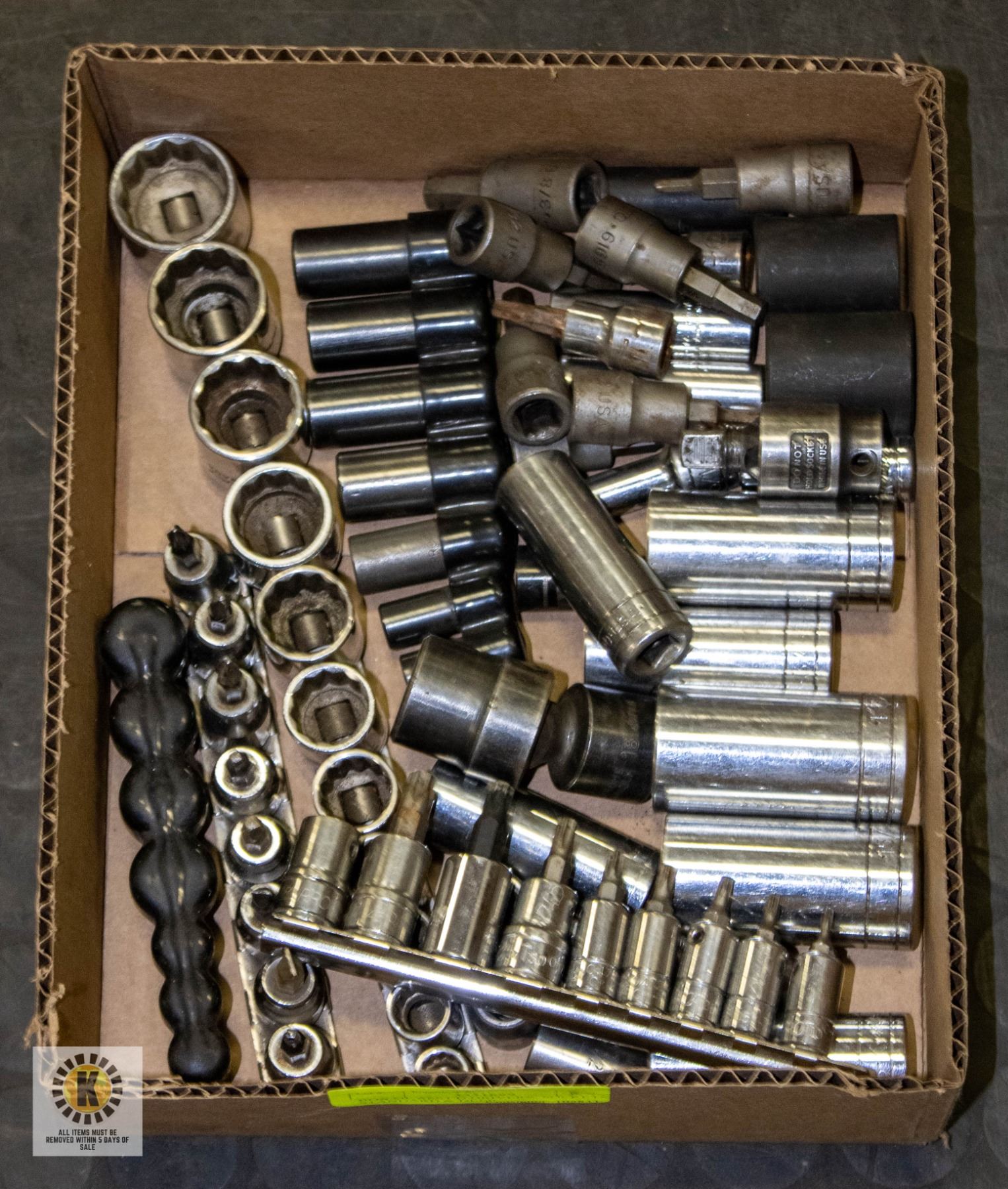 BOX OF ASST'D DRIVERS/ SOCKETS; STANDARD & DEEP