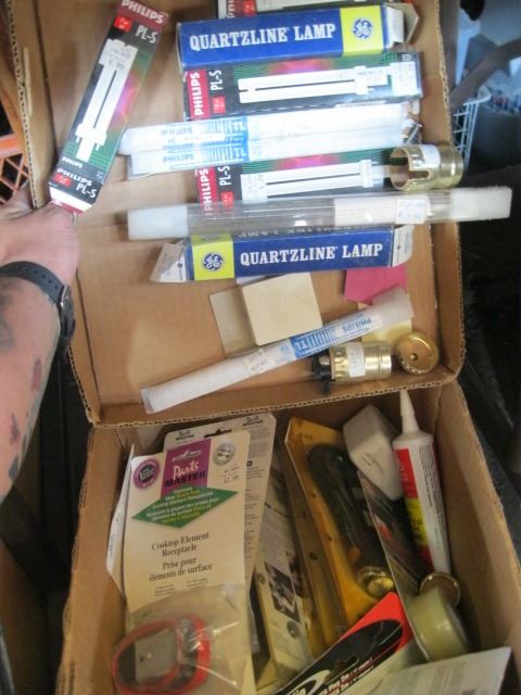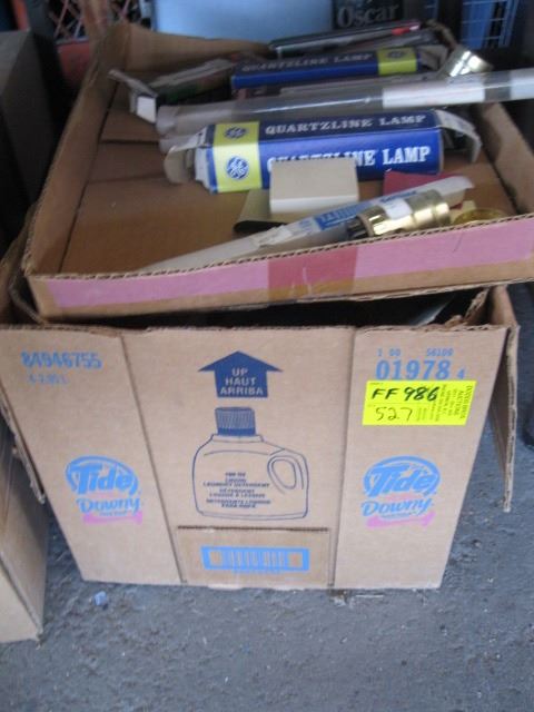 BOX OF ASST. NEW LIGHTBULBS, FLASHLIGHTS, COOKTOP ELEMENT RECEPTACLES, ETC.