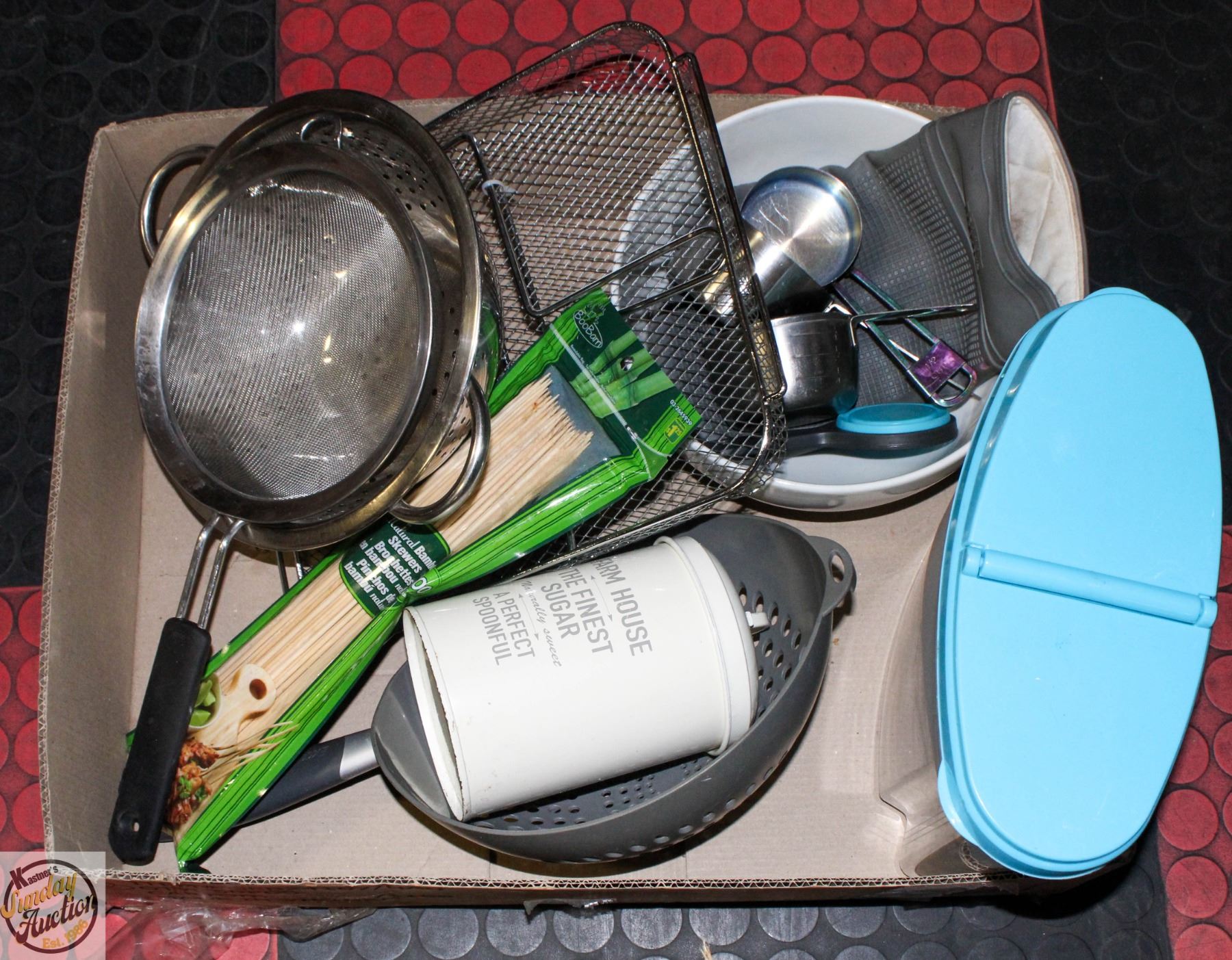 BOX OF BAKING ITEMS - STRAINERS, MEASURING