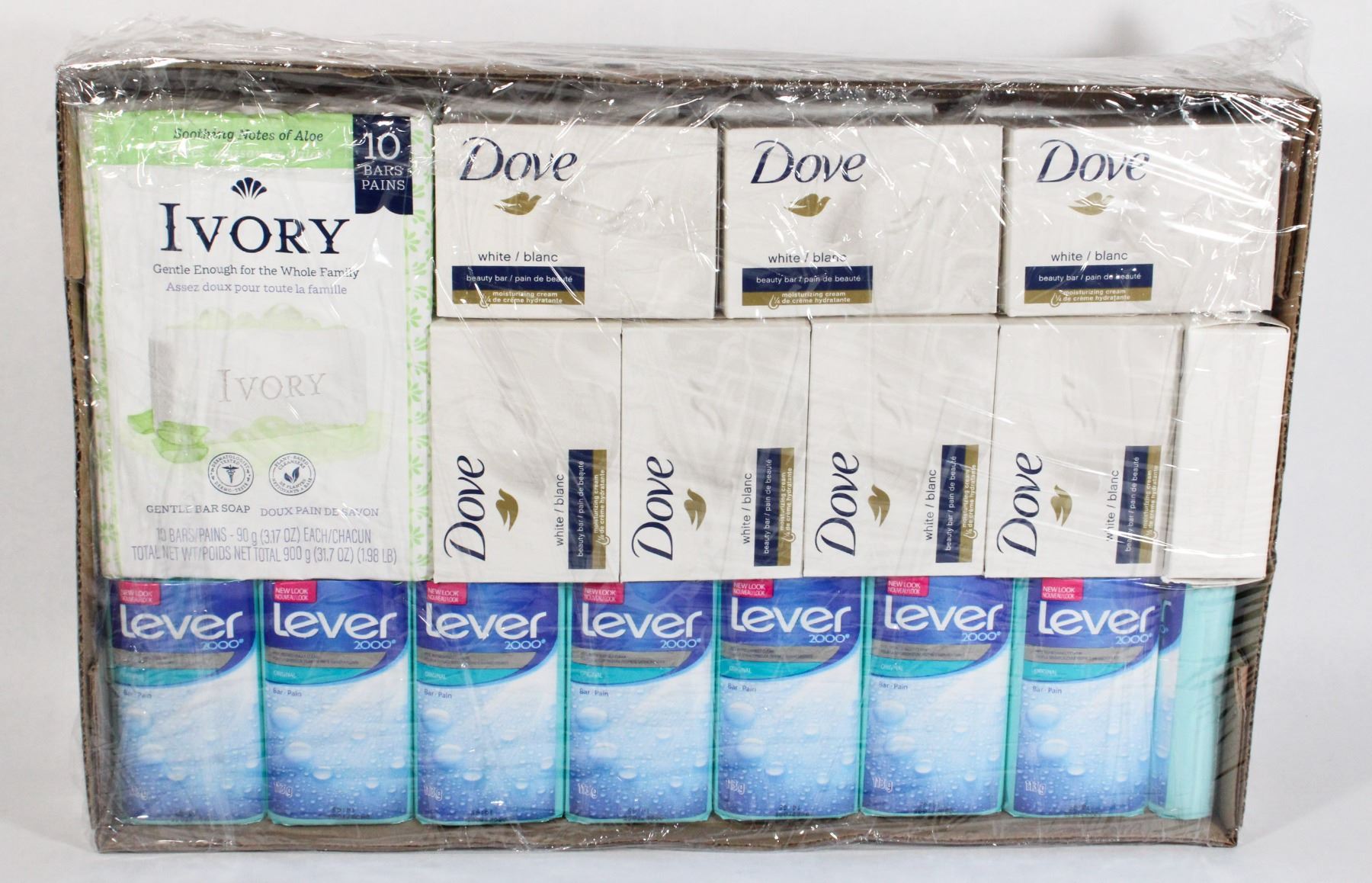 BOX OF BAR SOAP INCLUDING DOVE, IVORY, AND
