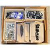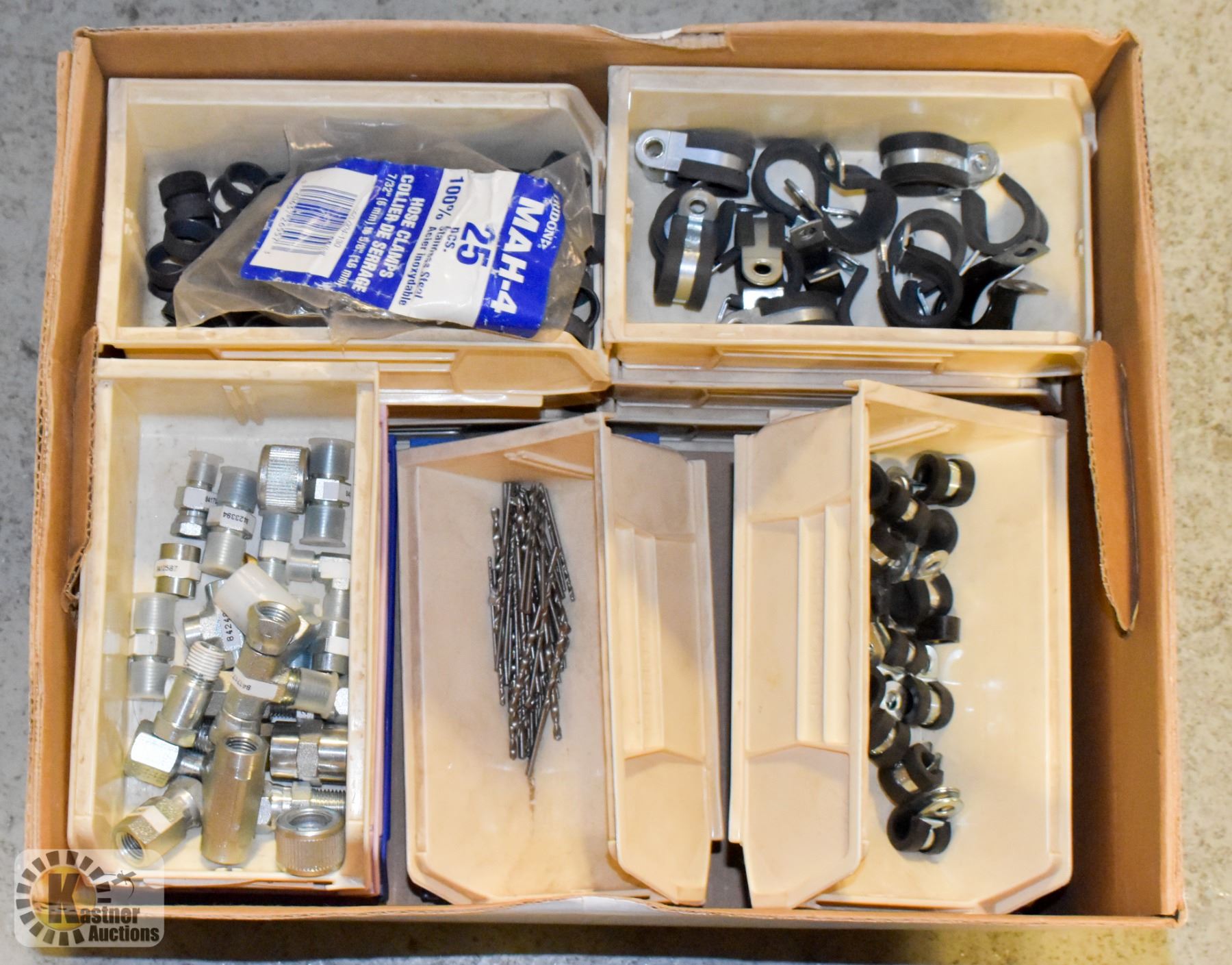 BOX OF BOLTS, DRILL BITS, FITTINGS AND CLAMPS