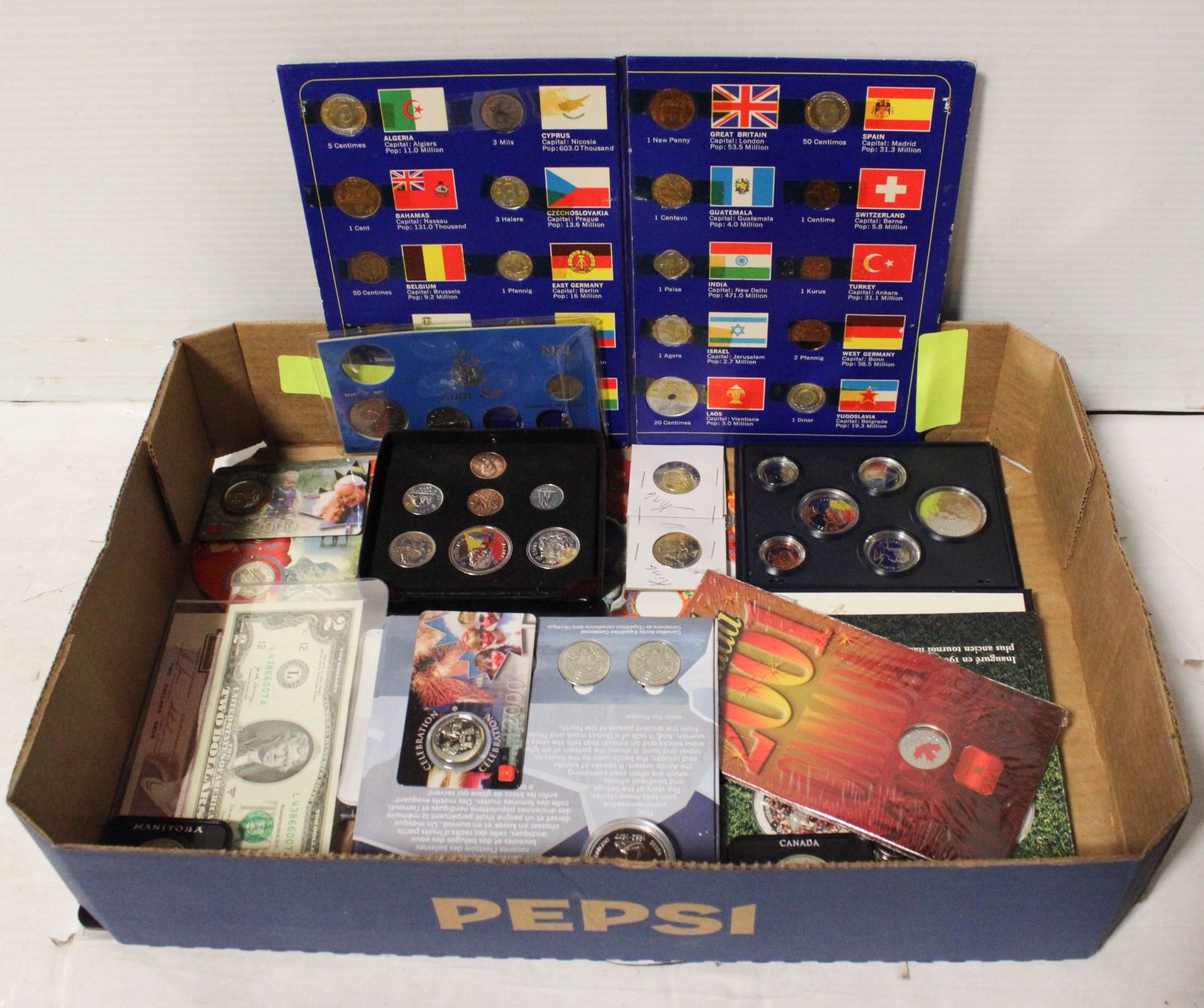 BOX OF CANADIAN AND WORLD COINS WITH SOME BILLS
