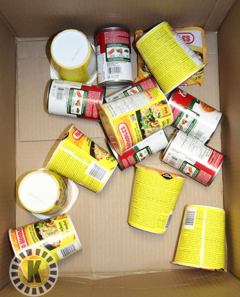 BOX OF CANNED SOUP AND NOODLES IN A CUP