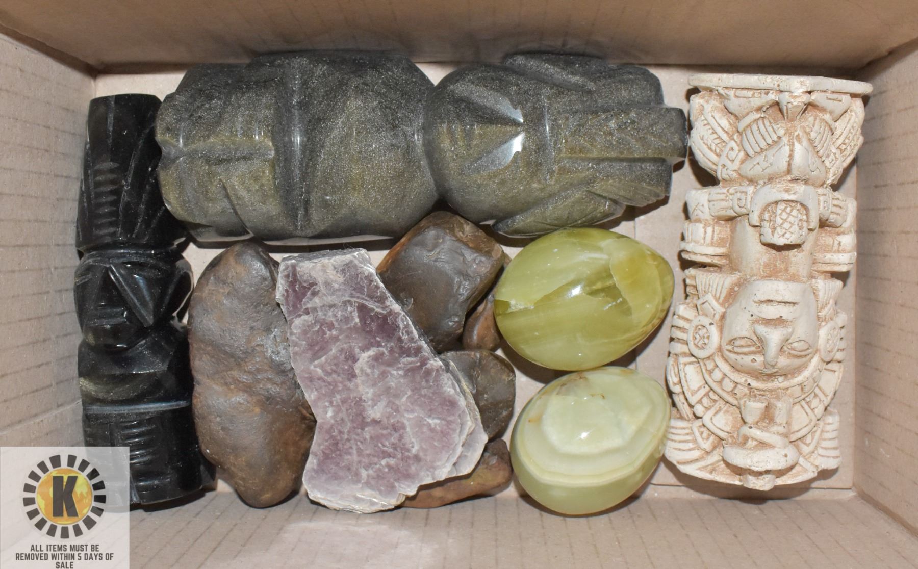 BOX OF CARVED STONE FIGURINES, STONE EGGS +