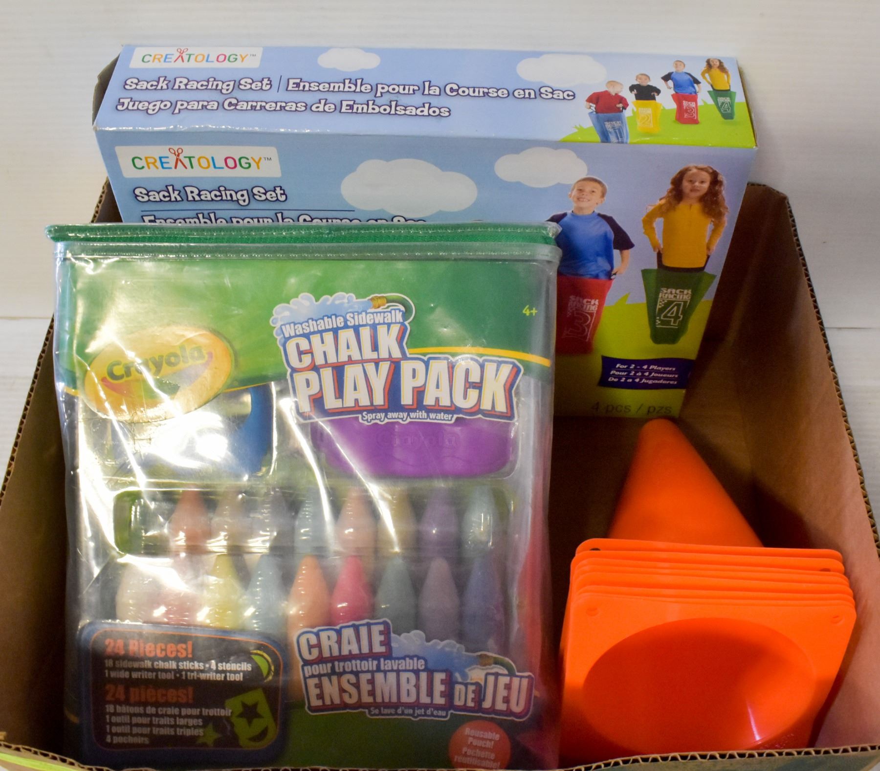 NEW CRAYOLA CHALK PLAY PACK 18 CHALK AND STENCILS, CREATOLOGY SACK RACING SET WITH 8 ORANGE CONES
