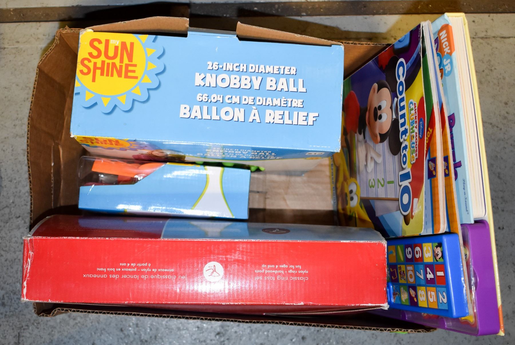 INCL. 26 INCH KNOBBY BALL, INDOOR/OUTDOOR RING-TOSS GAME, NEW SIDEWALK CHALK BOX WITH ACCESSORIES, DORA PUZZLE ACTIVITY BOOK, MICKEY MOUSE INTERACTIVE BOOK