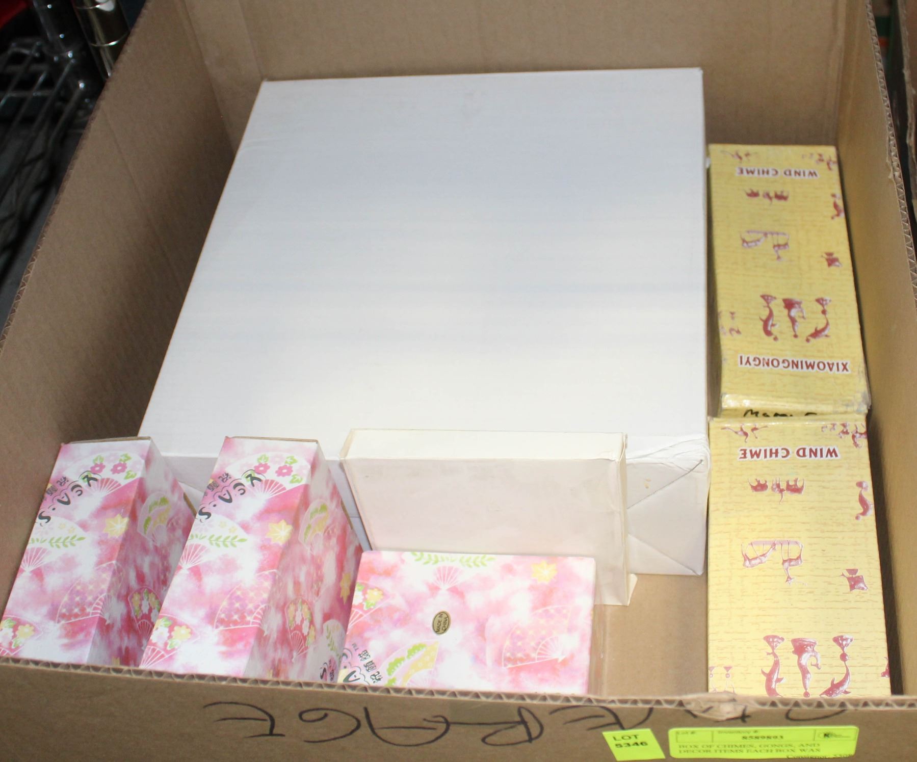 BOX OF CHIMES, GONGS, AND DECOR ITEMS EACH BOX WAS