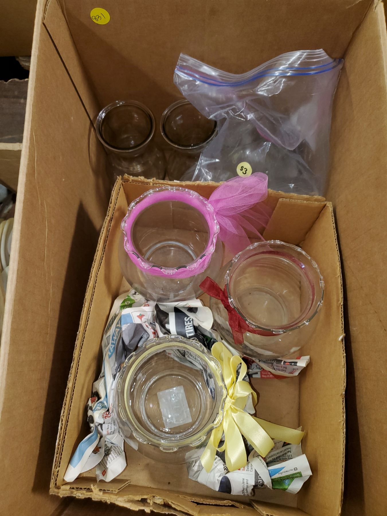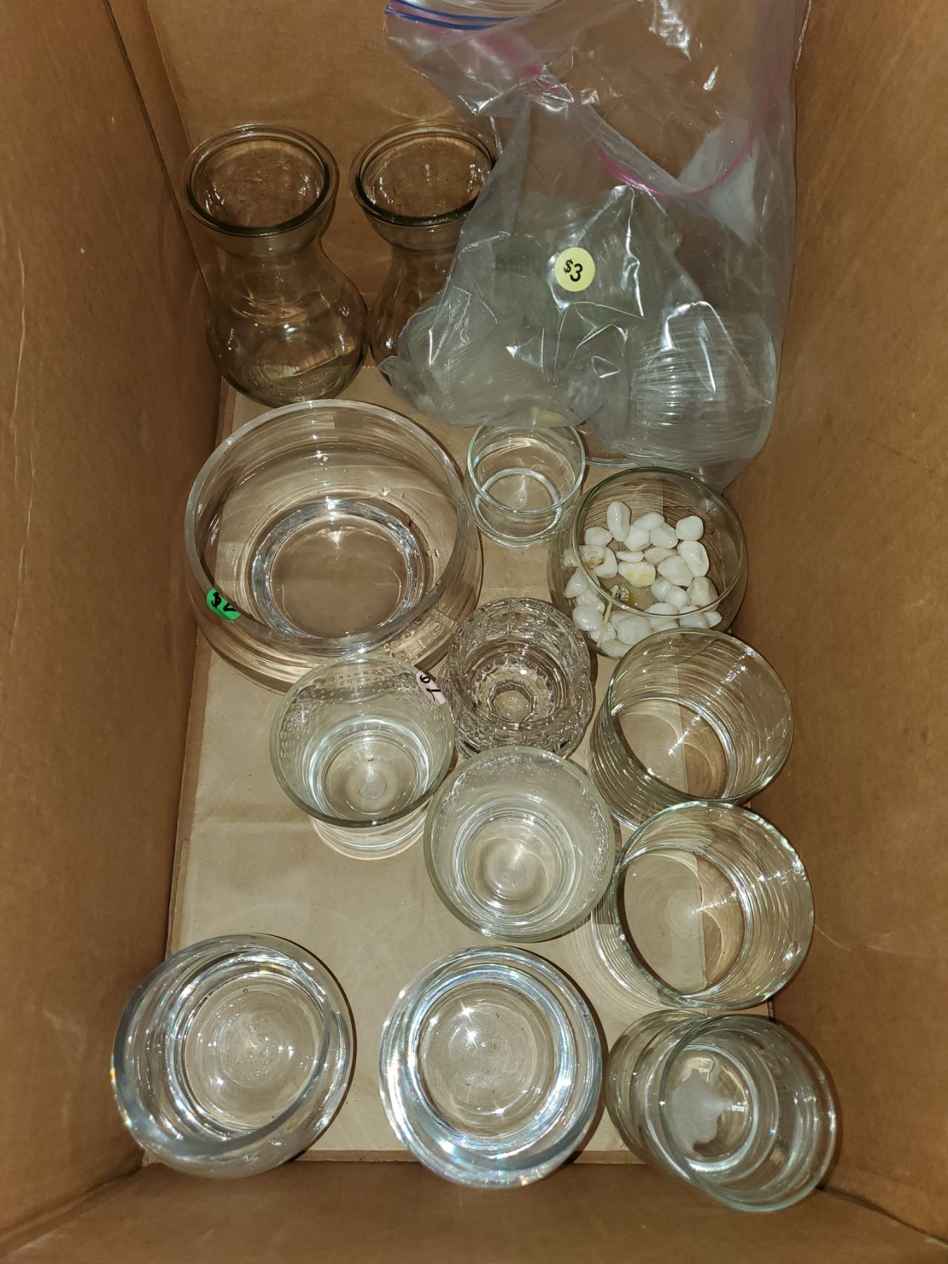 BOX OF CLEAR GLASS (VASES, BOWLS, ETC)