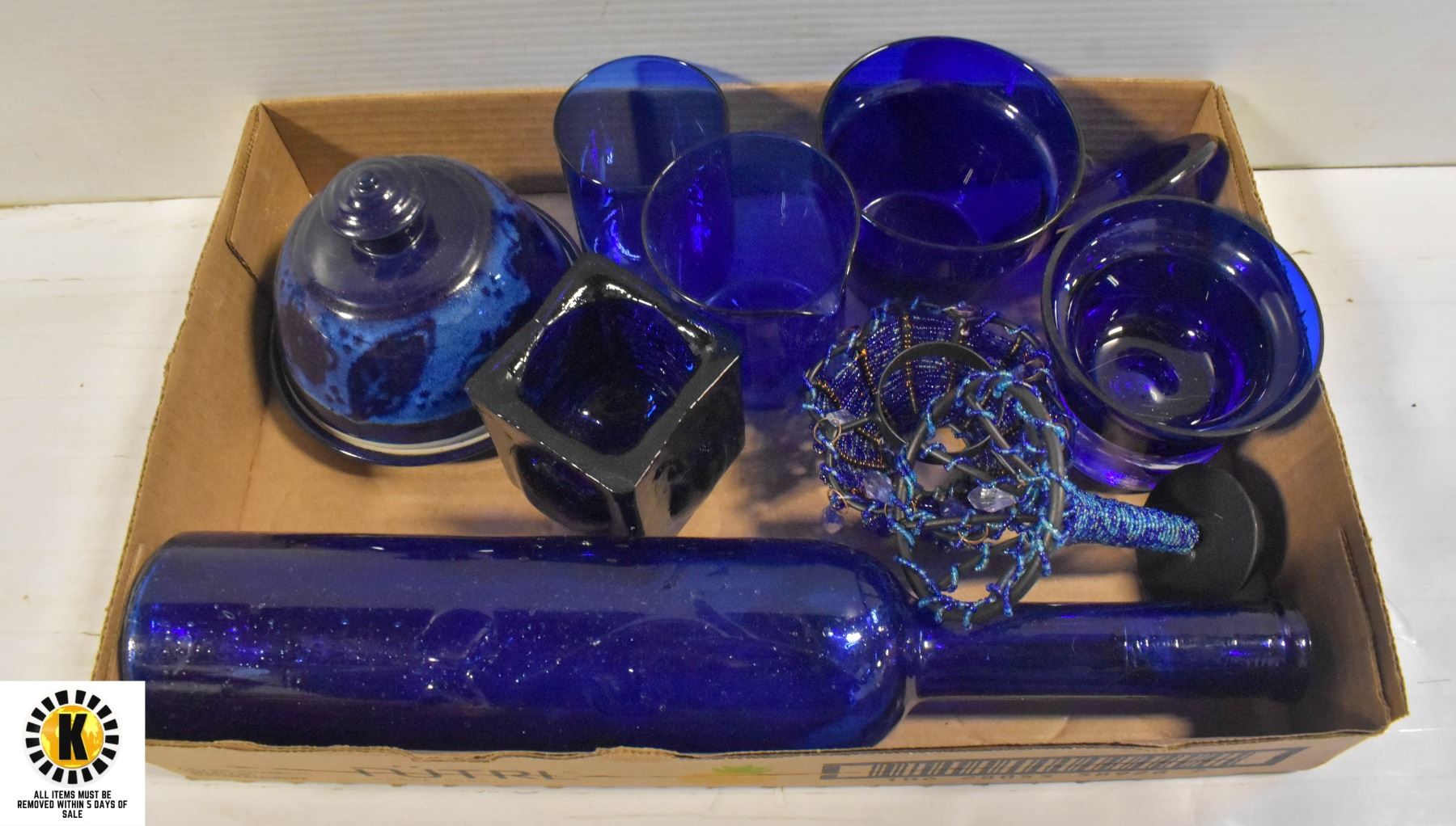 BOX OF COBLT BLUE GLASSWARE AND MORE