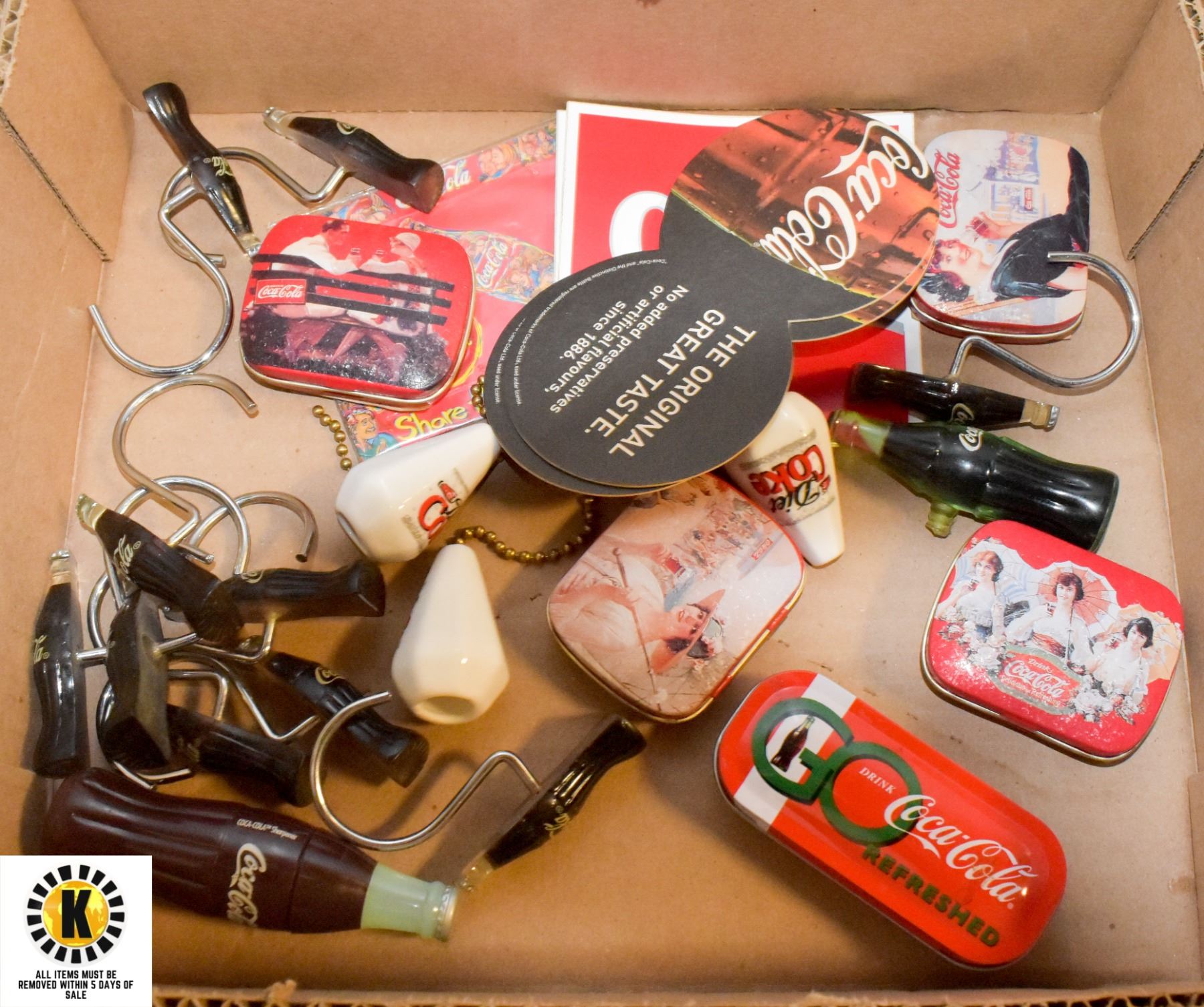 BOX OF COCA-COLA MINIATURES, PILL TINS, SHOWER