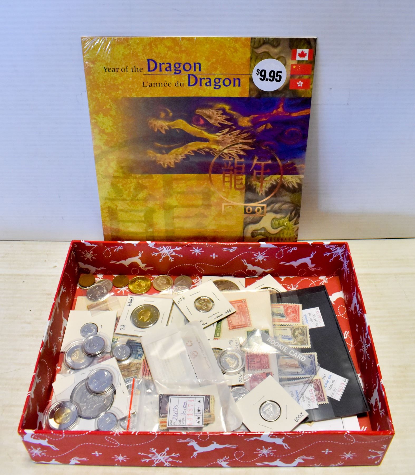 BOX OF COINS AND STAMPS, SPECIMEN AND PROOF