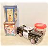 BOX OF COLLECTABLE TINS INCLUDING A POLICE CAR, CO