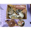 BOX OF COLLECTABLES, METAL SKATES, BELLOWS ETC.