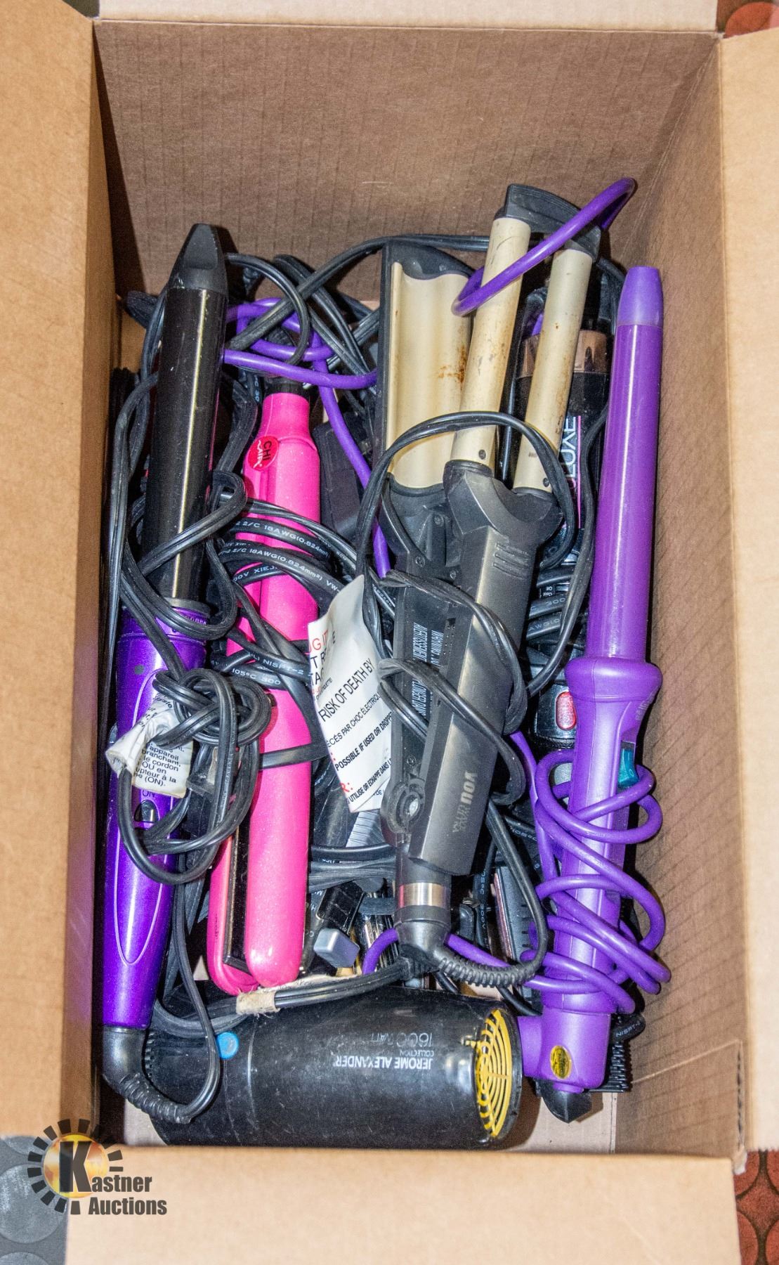 BOX OF CURLING IRONS, STRAITENERS,CRIMPERS ETC