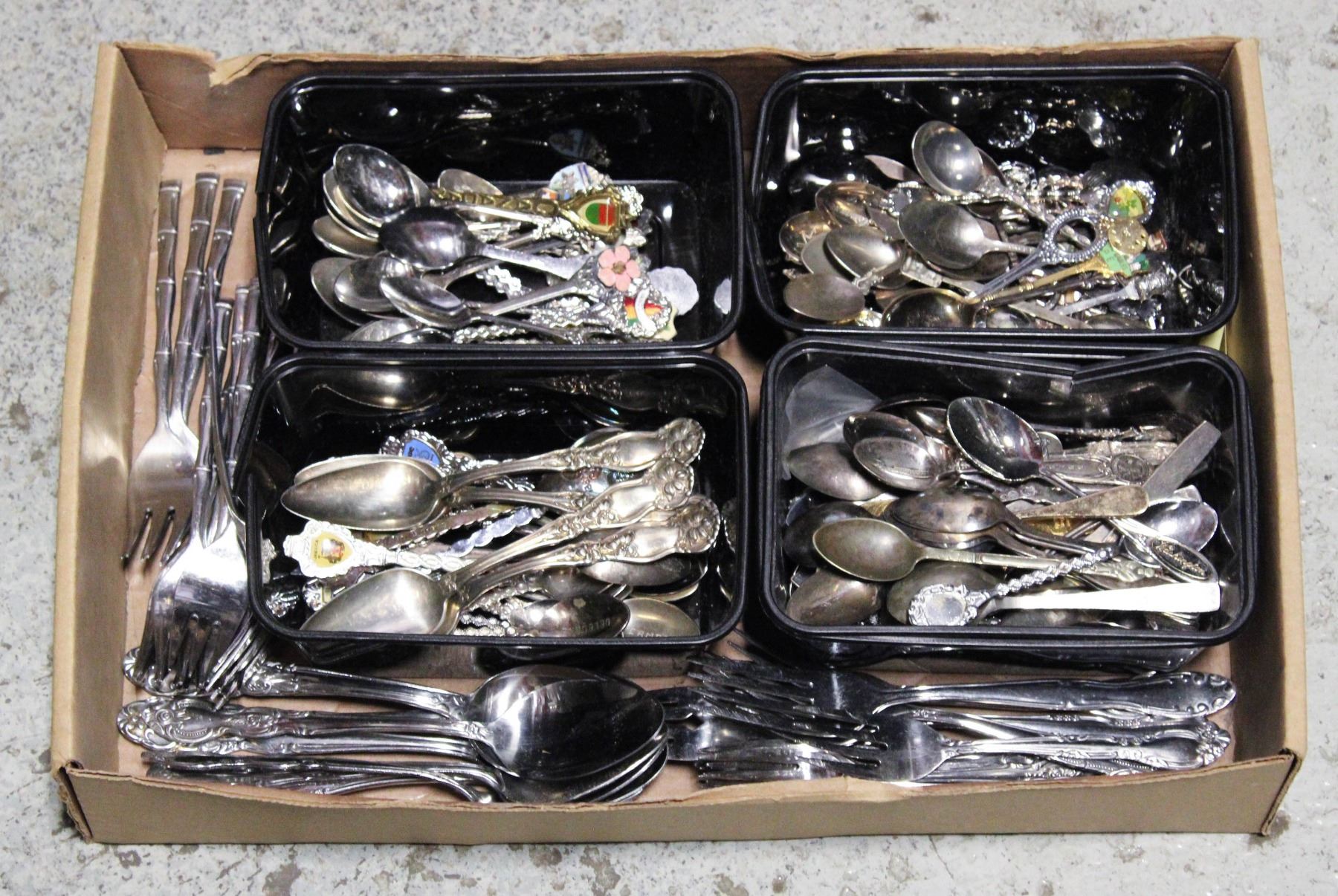 BOX OF CUTLERY AND COLLECTOR SPOONS LARGE LOT