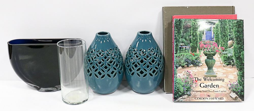 BOX OF DECOR ITEMS INCLUDING 2 BLUE VASES AND