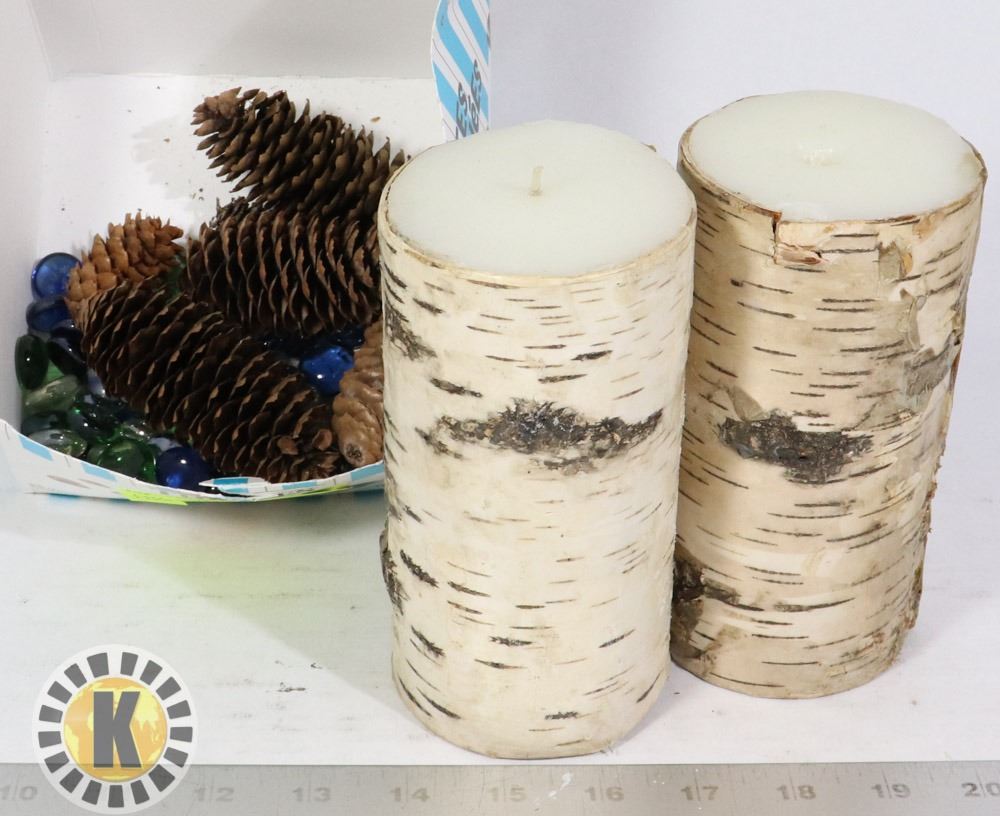 BOX OF DECORATIONS- CANDLES, CRYSTALS AND CONES