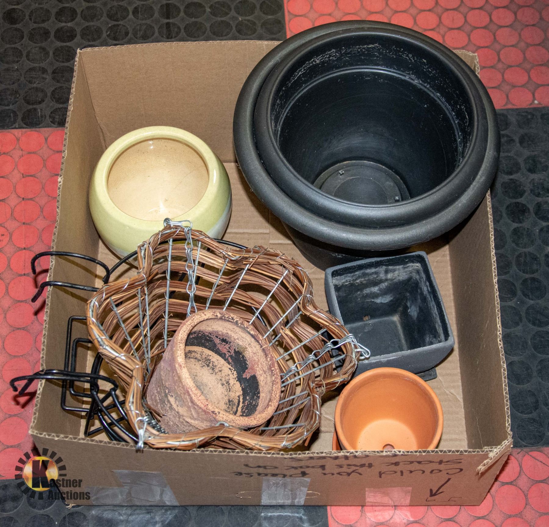 HANGING WICKER CONE PLANTER, 2 METAL FENCE PLANT HANGERS, SEVERAL CERAMIC AND NYLON POTTERY POTS **ALL ITEMS MUST BE REMOVED BY 5PM SATURDAY, JUNE 10TH 2023. ALL REMAINING ITEMS WILL BE SUBJECT TO A $6.00 PER DAY STORAGE CHARGE. ANY ITEMS REMAINING AFTER MONDAY, JUNE 26TH, 2023 WILL BE CONSIDERED FORFEITED. NO REFUNDS WILL BE ISSUED FOR FORFEITED ITEMS. TO SCHEDULE A PICK UP APPOINTMENT CLICK HERE