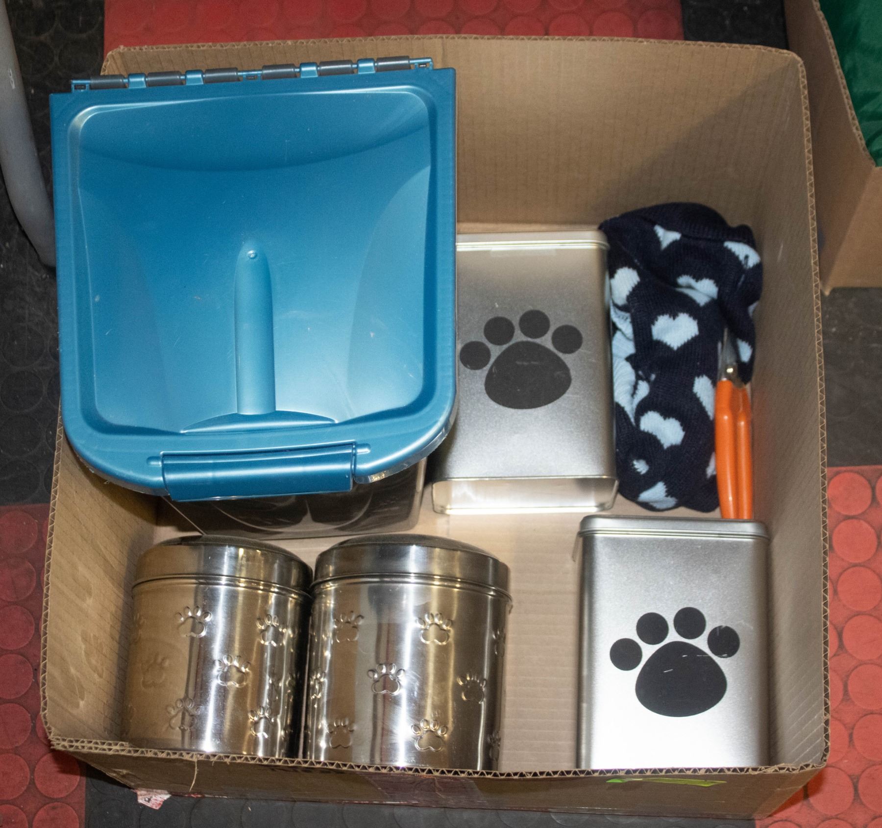 STORAGE CONTAINER, 4 METAL TREAT STORAGE CONTAINERS, MED-LARGE PET SWEATER, NAIL CLIPPER **ALL ITEMS MUST BE REMOVED BY 5PM SATURDAY, MAY 11THTH 2024. ALL REMAINING ITEMS WILL BE SUBJECT TO A $6.00 PER DAY STORAGE CHARGE. ANY ITEMS REMAINING AFTER MONDAY, MAY 27TH 2024 WILL BE CONSIDERED FORFEITED. NO REFUNDS WILL BE ISSUED FOR FORFEITED ITEMS. TO SCHEDULE A PICK UP APPOINTMENT CLICK HERE