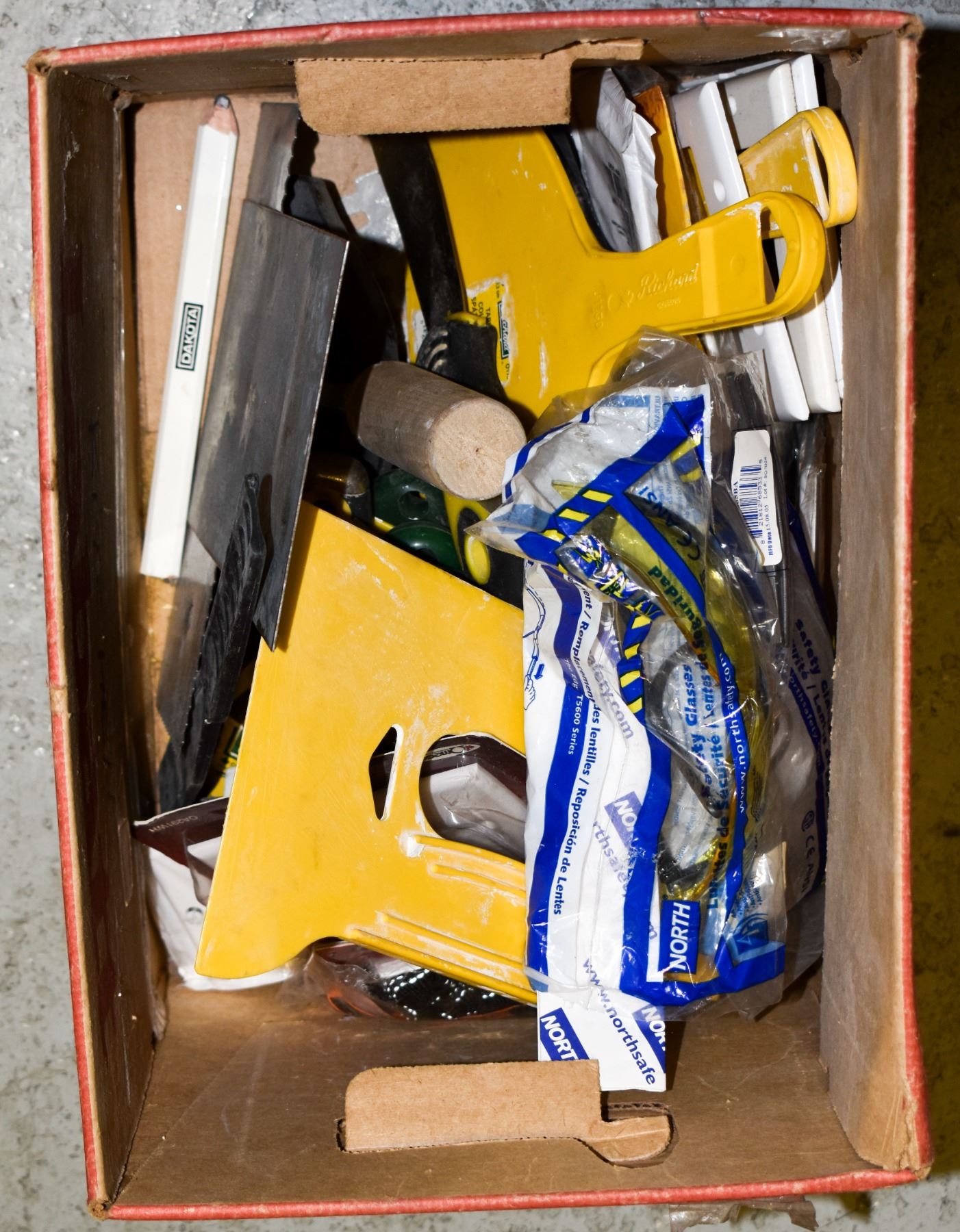 BOX OF DRYWALL TOOLS AND ACCESSORIES