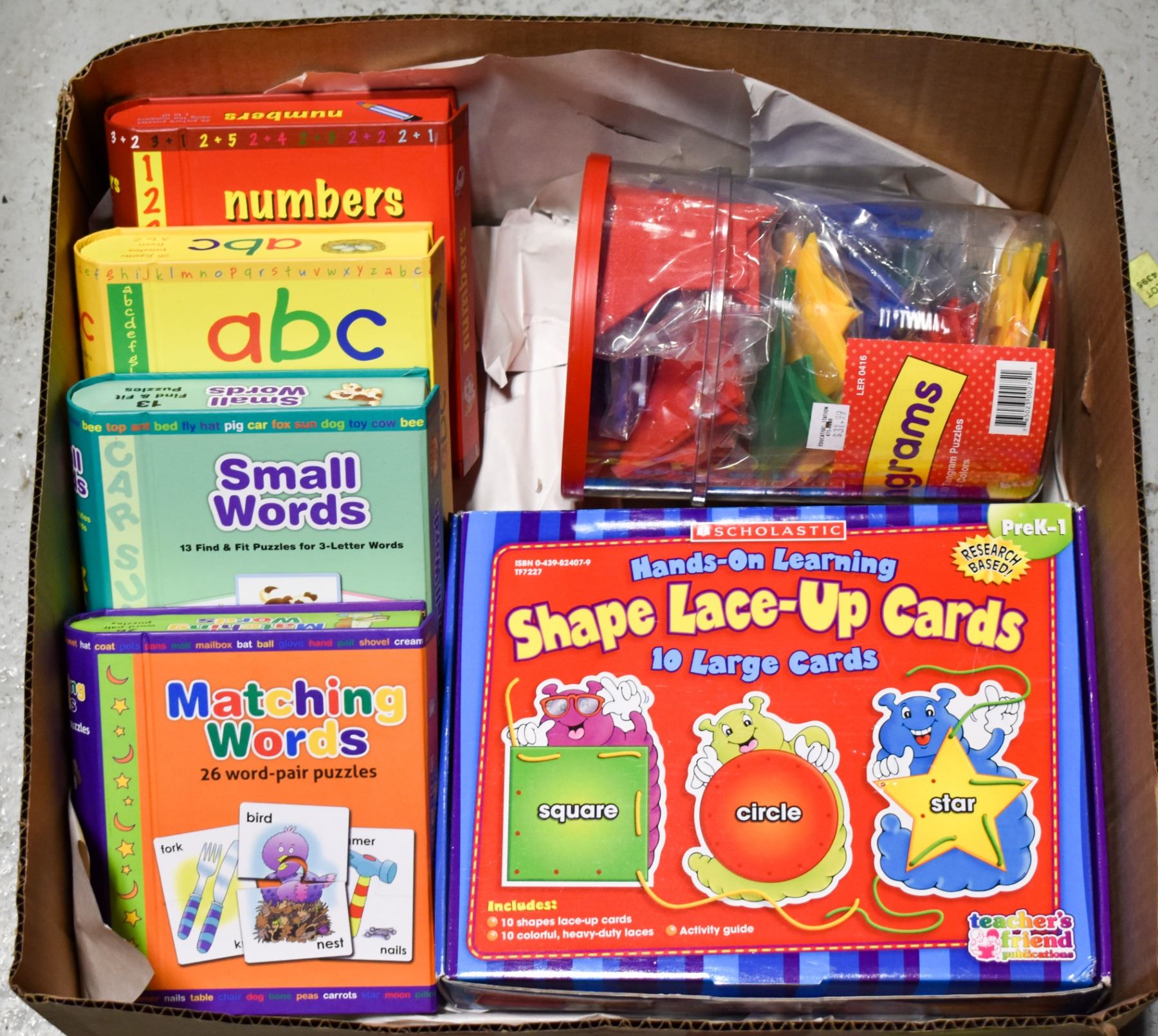 BOX OF EARLY LEARNING PUZZLES, TANGRAMS AND