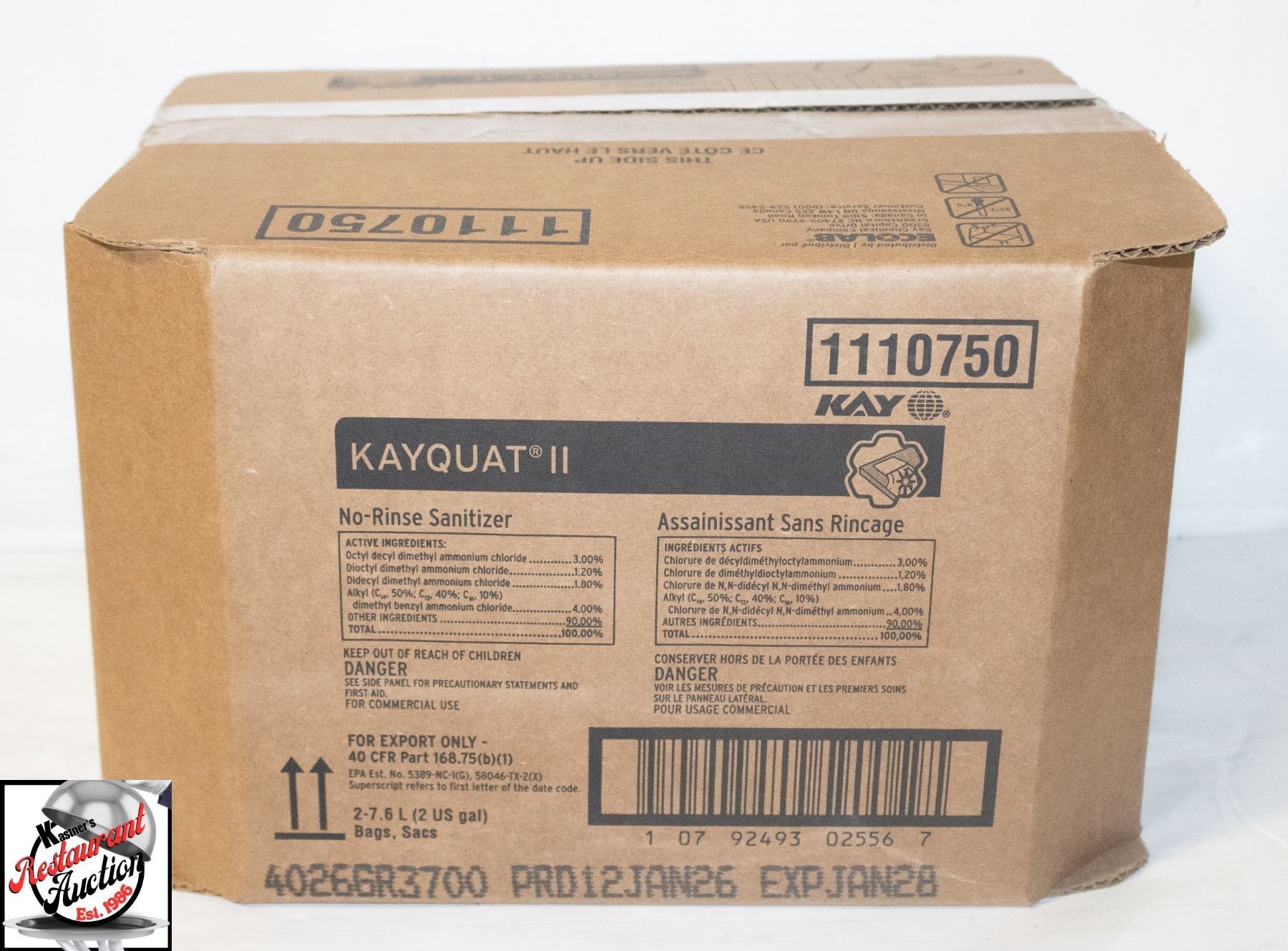 BOX OF ECOLAB KAY QUAT II NO RINSE SANATIZER