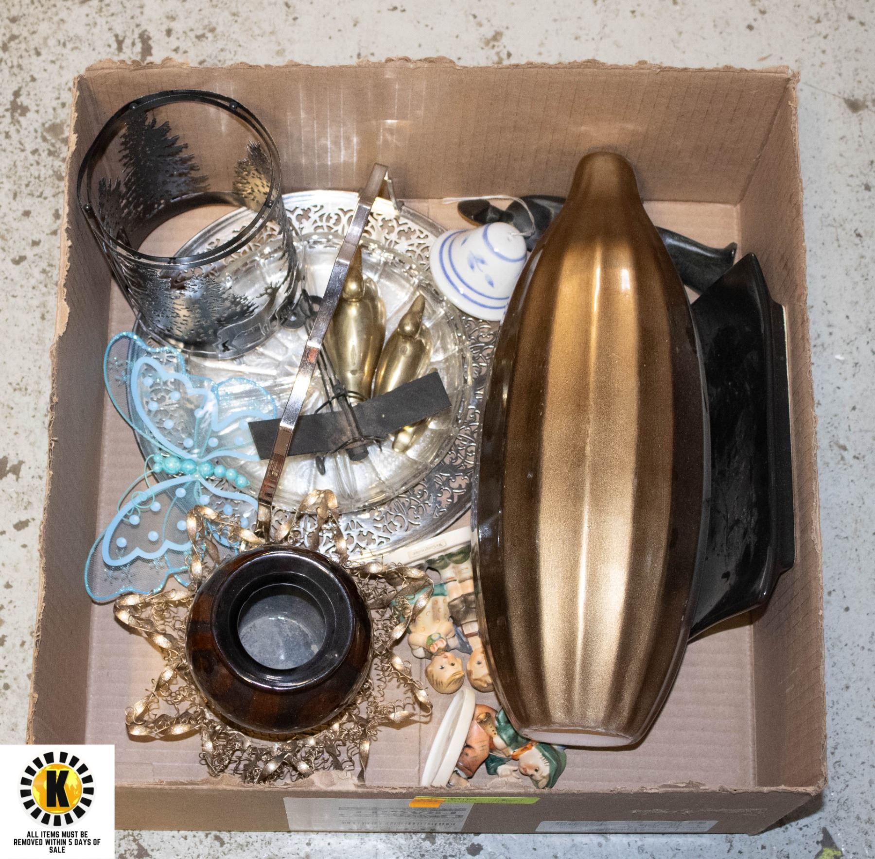 BOX OF ESTATE DECOR + FLAT OF COLLECTIBLE TINS