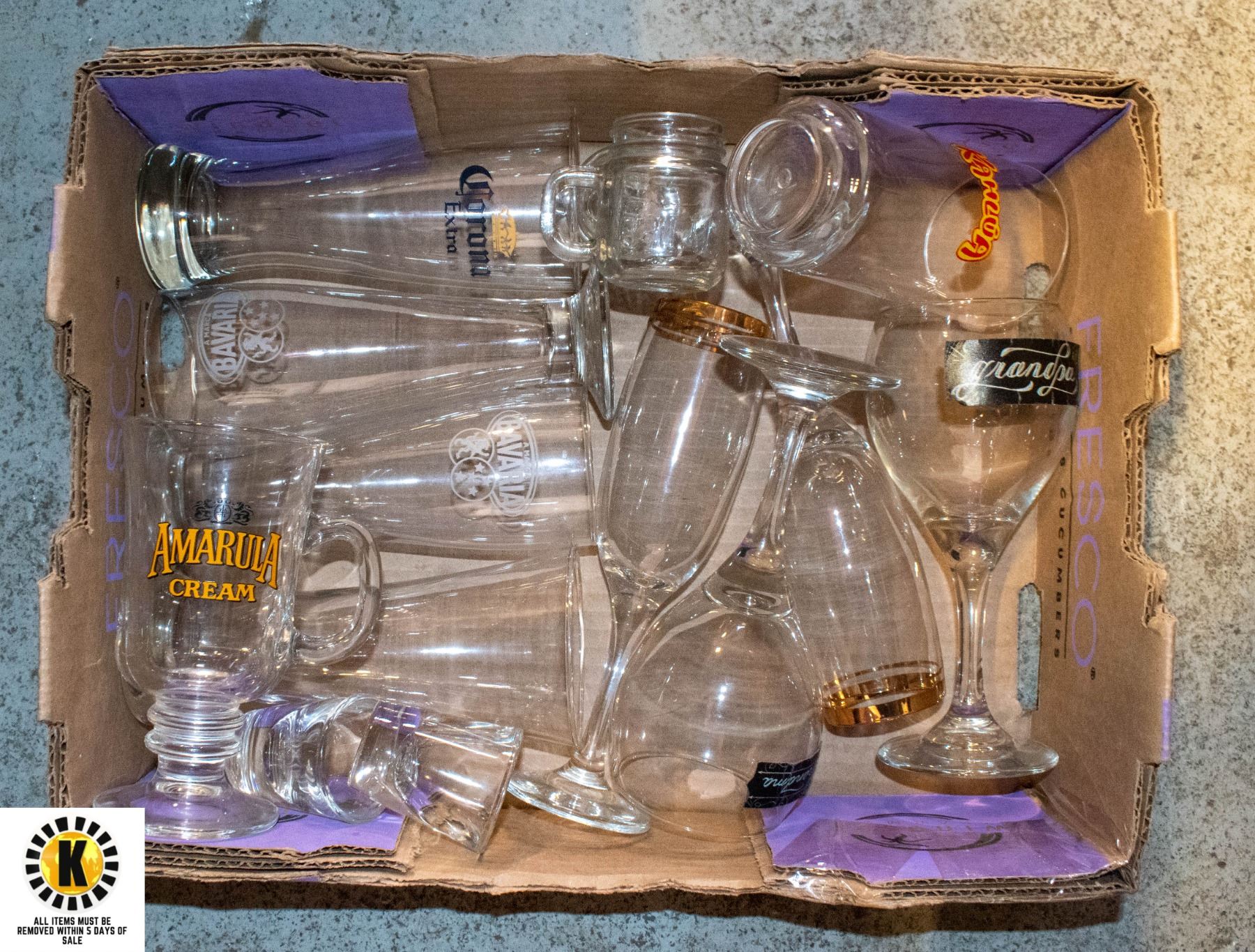 BOX OF ESTATE GLASSWARE + MINI GLASS MUG