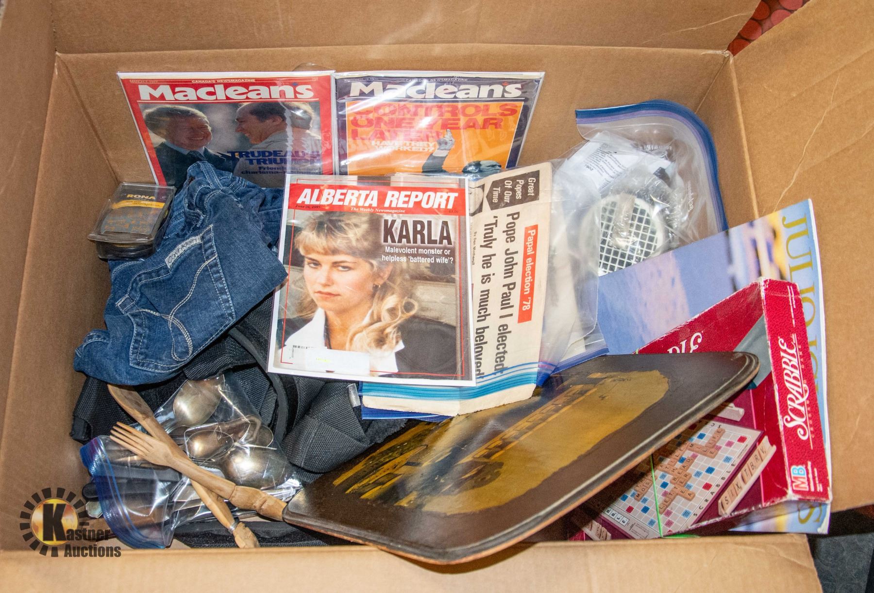 BOX OF ESTATE MISC COLLECTIBLES, HOUSEHOLD & MORE