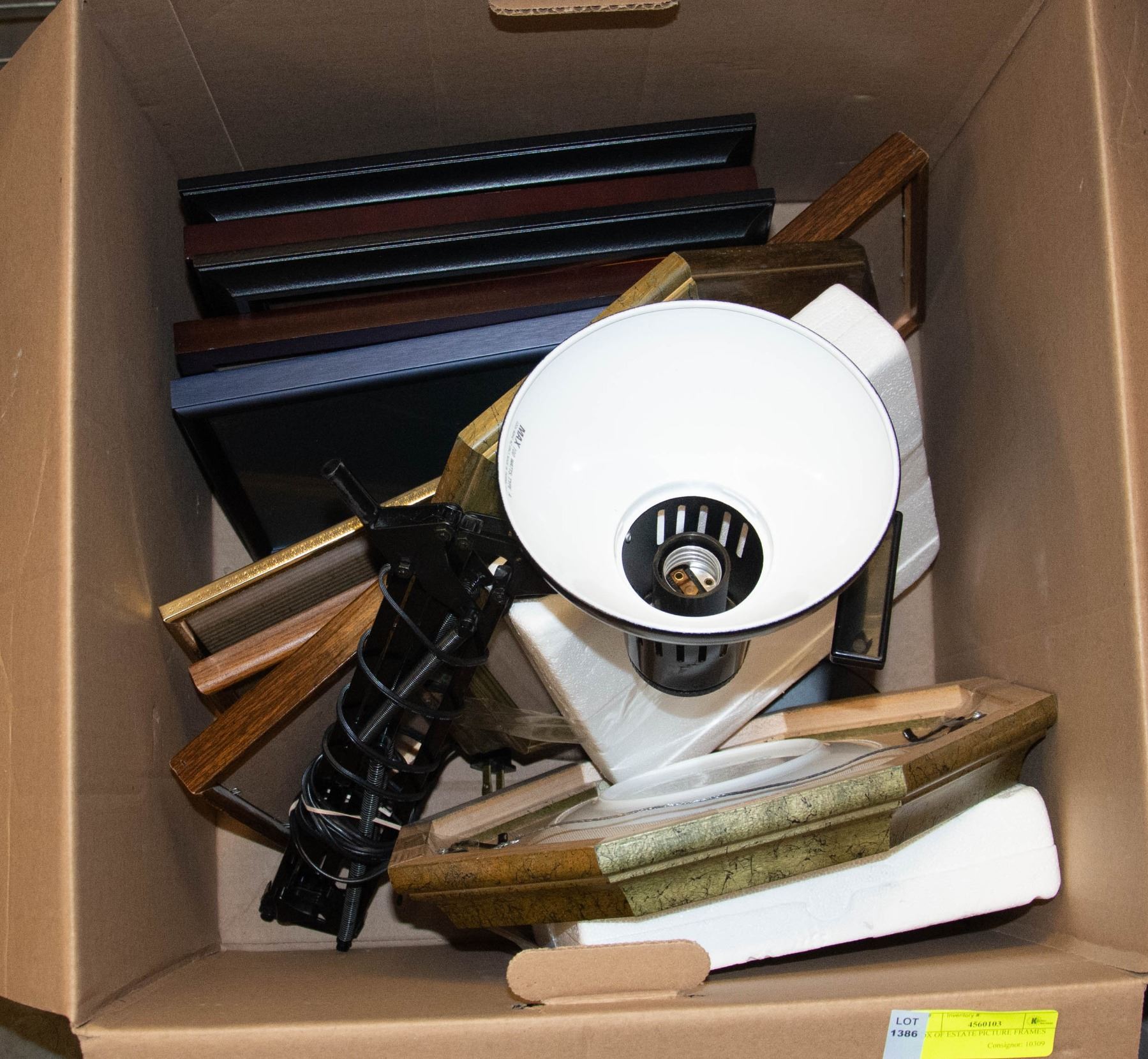 BOX OF ESTATE PICTURE FRAMES + LAMP, ETC