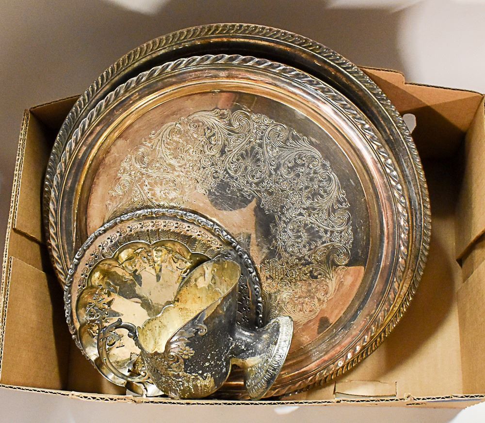 BOX OF ESTATE SILVER PLATED TRAYS & MORE