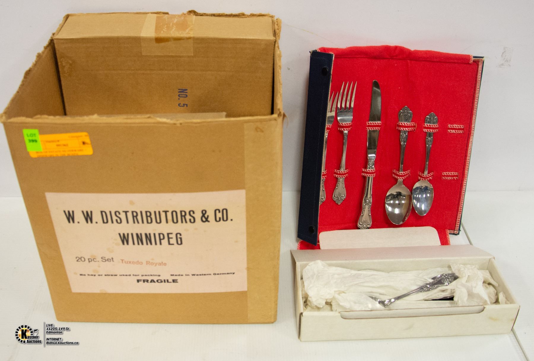 BOX OF ESTATE SILVERWARE + DISHWARE IN THE BOXES