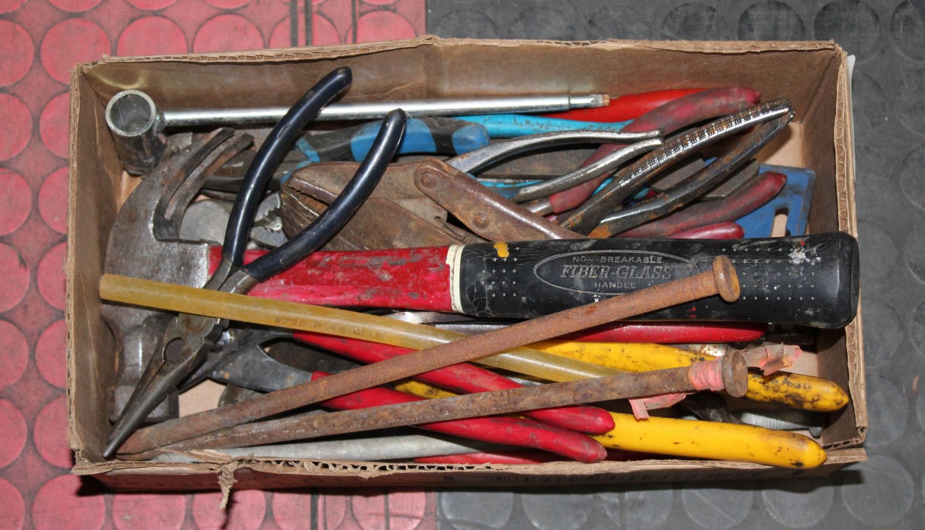 BOX OF ESTATE TOOLS INCLUDES SNIPS, PLIERS & MORE