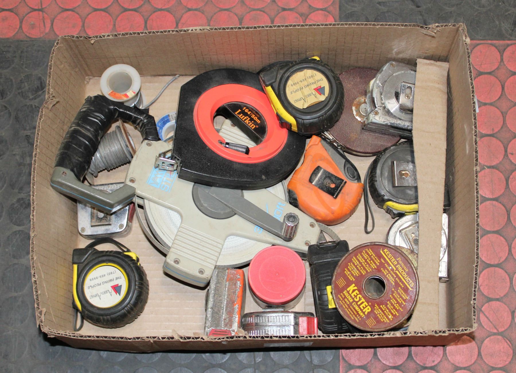 BOX OF ESTATE TOOLS INCLUDES TAPE MEASURES, SOLDER