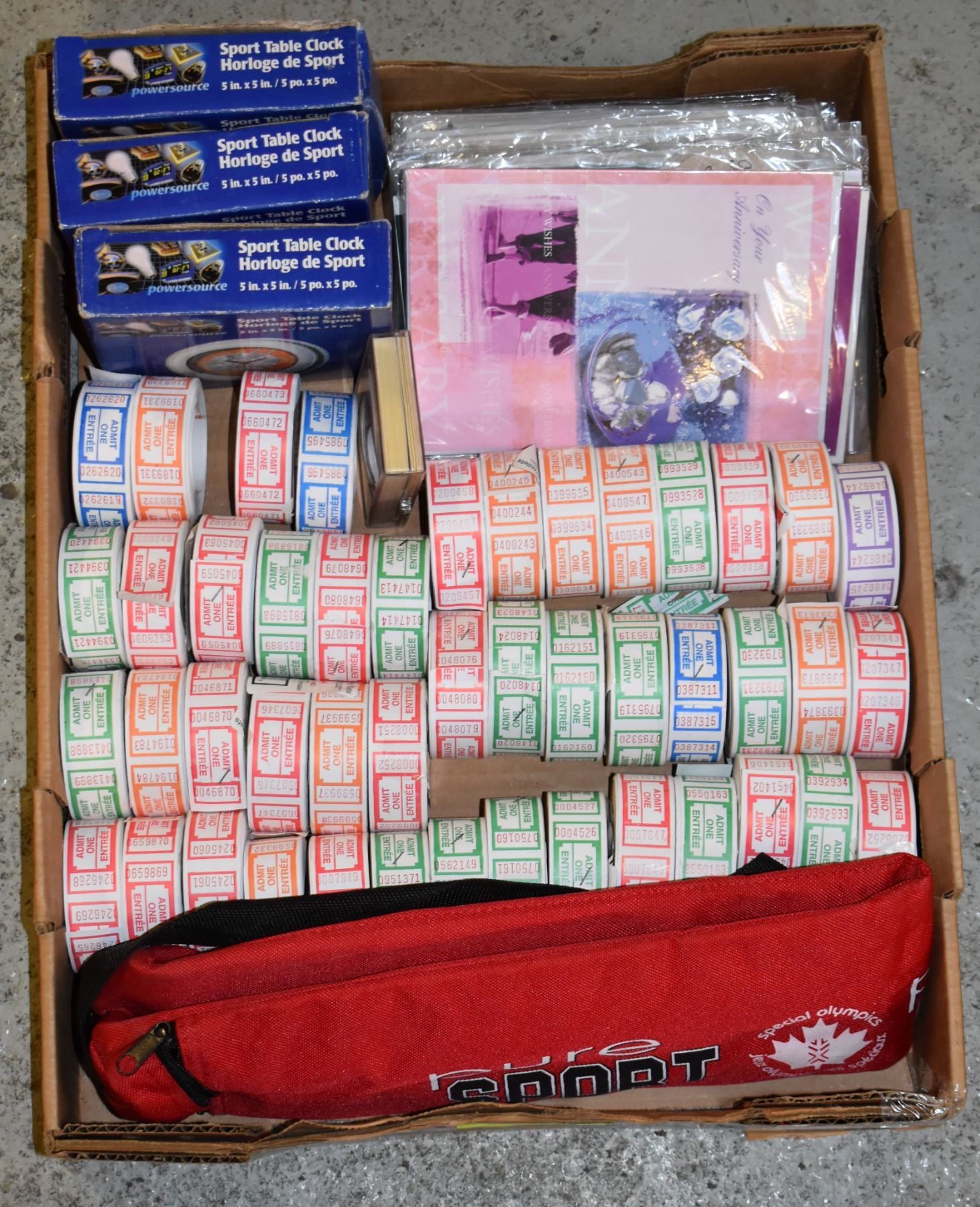 BOX OF EVENT TICKETS, OCCASSION CARDS & CLOCKS