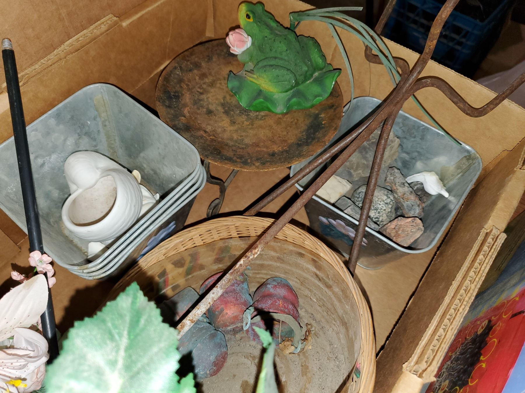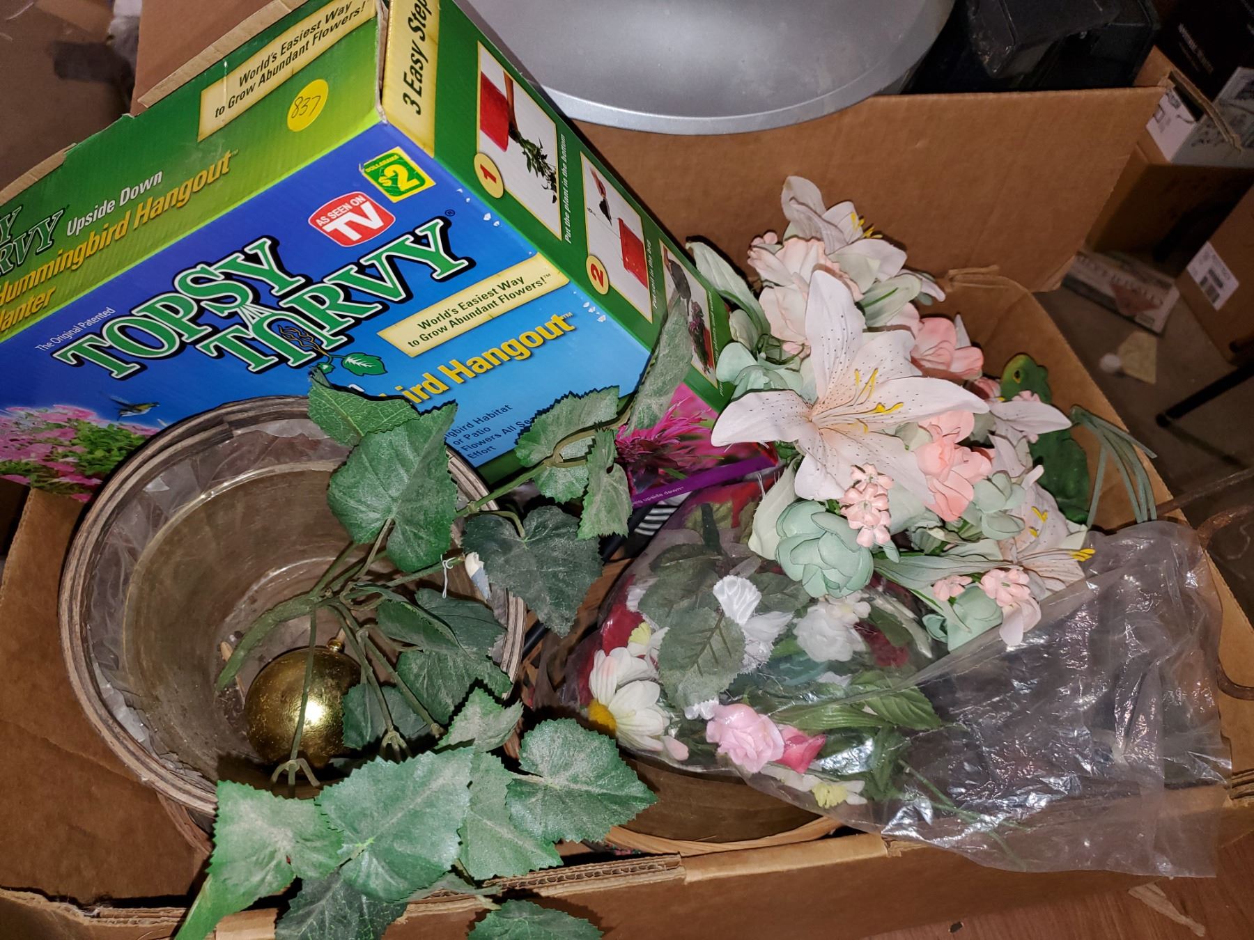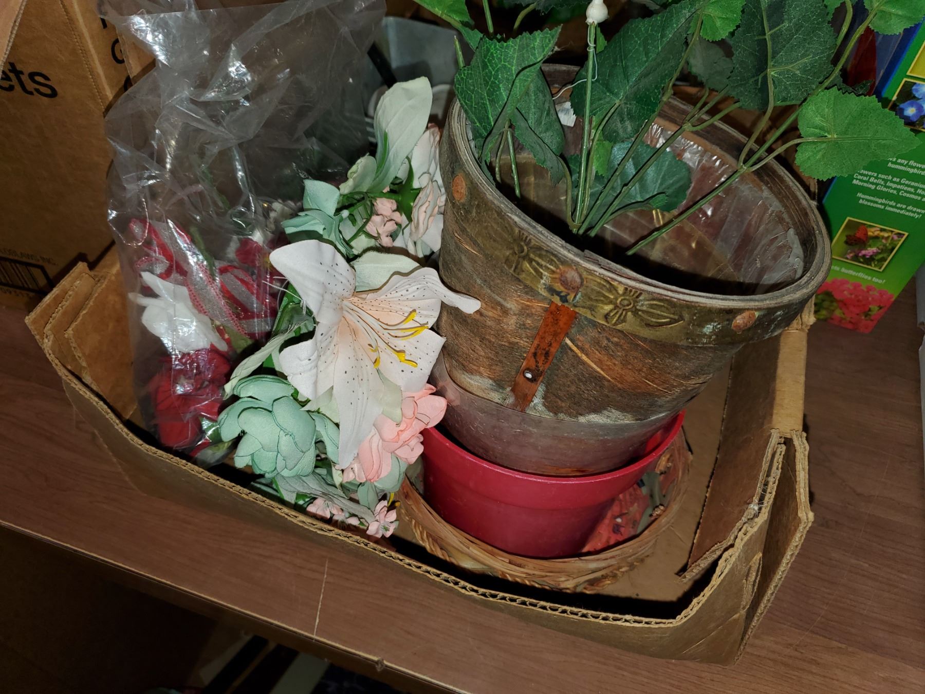 BOX OF FLOWER POTS, FLOWERS, ETC