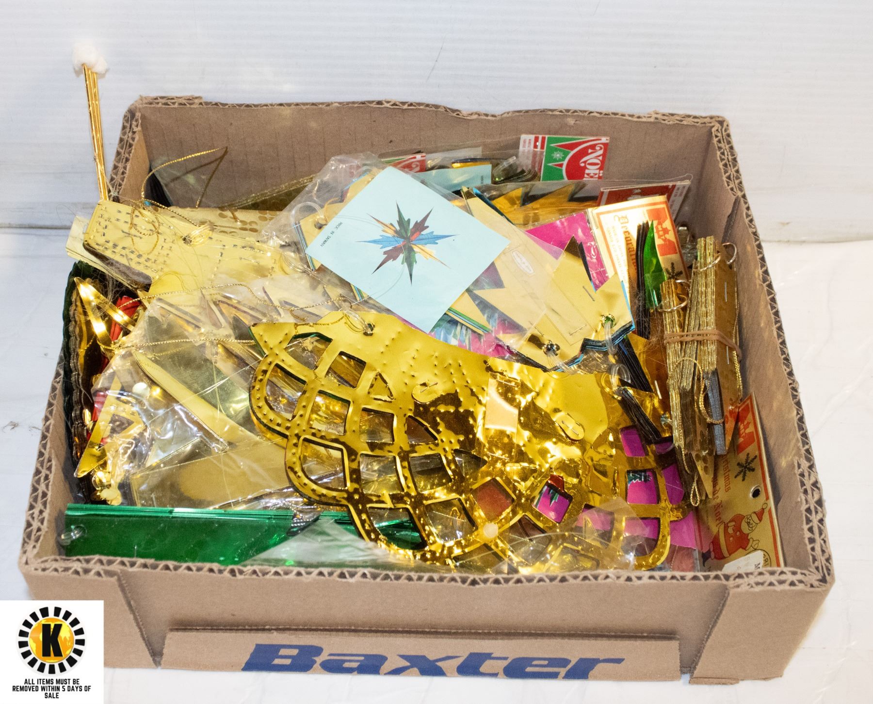 BOX OF FOIL BELLS, TREES, STARS, BANNERS & MORE