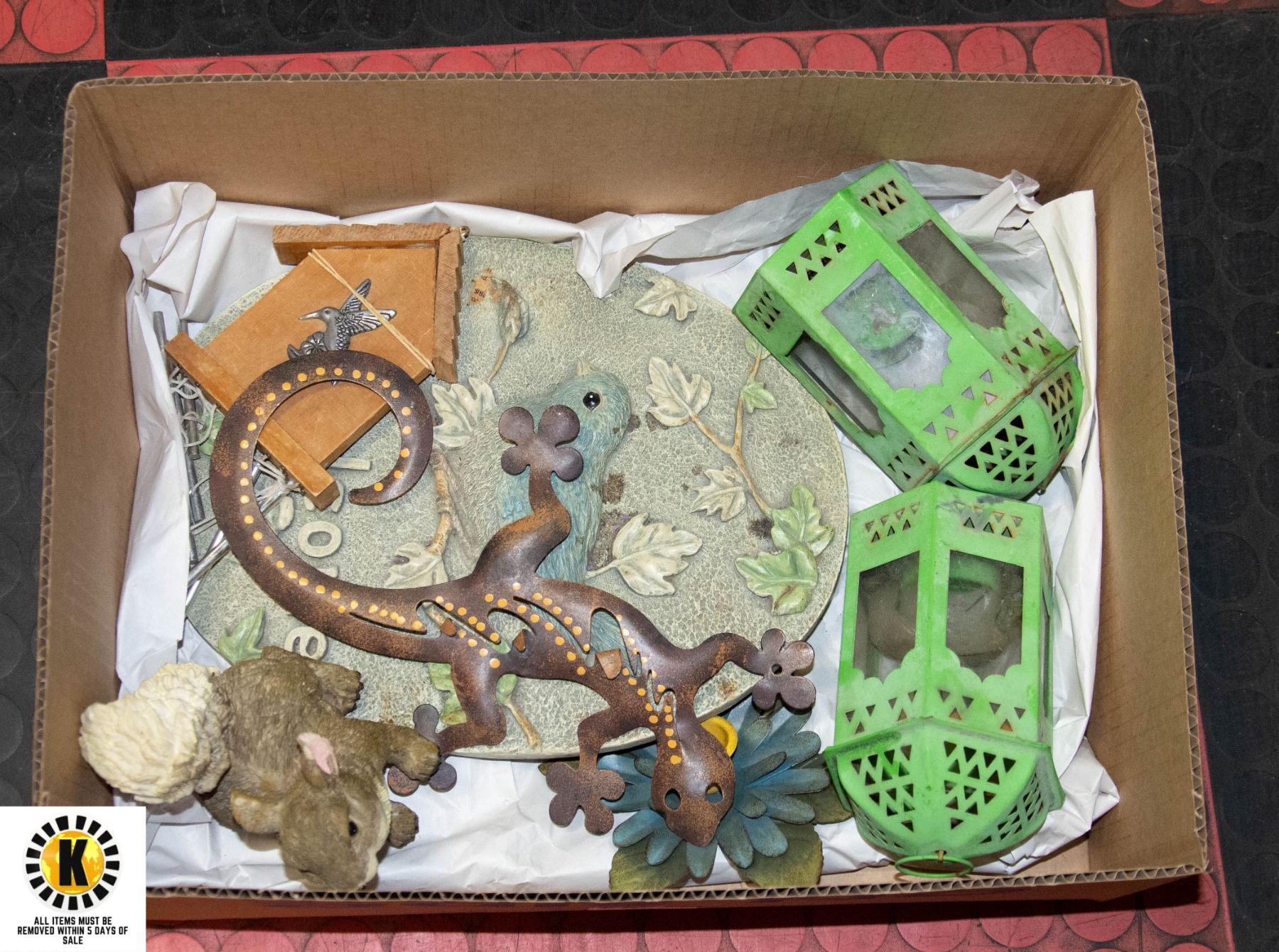 SQUIRREL, METAL GECKO LIZARD, METAL FLOWER CANDLE STICK STAND, VINTAGE METAL CANDLE HOLDERS, CHIMES, LARGE WELCOME PLAQUE **ALL ITEMS MUST BE REMOVED BY 5PM SATURDAY, APRIL 22ND, 2023. ALL REMAINING ITEMS WILL BE SUBJECT TO A $6.00 PER DAY STORAGE CHARGE. ANY ITEMS REMAINING AFTER MONDAY, MAY 8TH, 2023 WILL BE CONSIDERED FORFEITED. NO REFUNDS WILL BE ISSUED FOR FORFEITED ITEMS.** TO SCHEDULE A PICK UP APPOINTMENT CLICK HERE