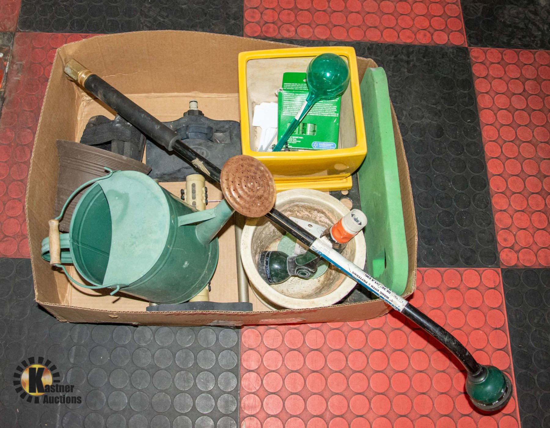 BOX OF GARDEN PLANTERS, SPRINKLERS,