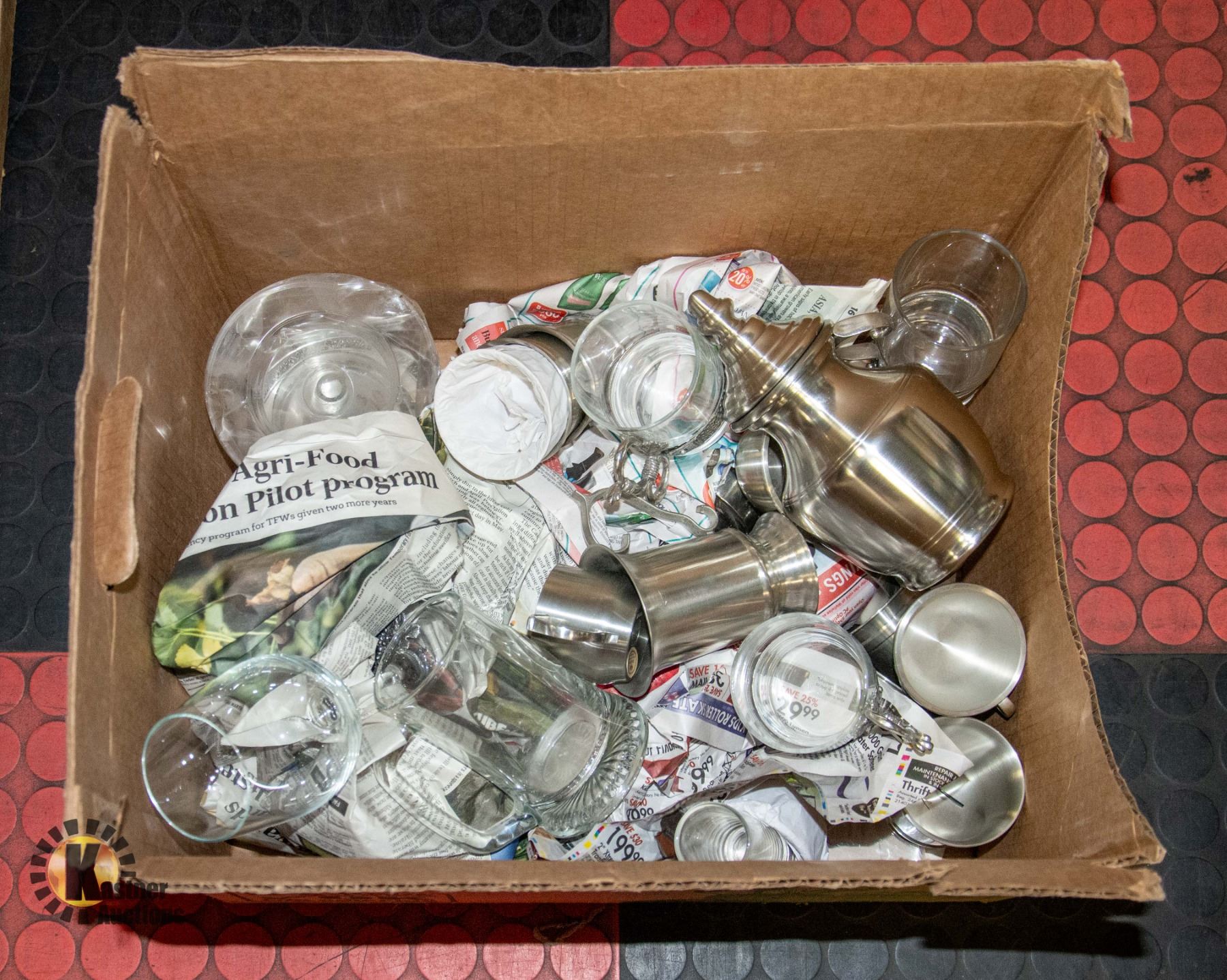 BOX OF GLASS/ PEWTER GLASSES