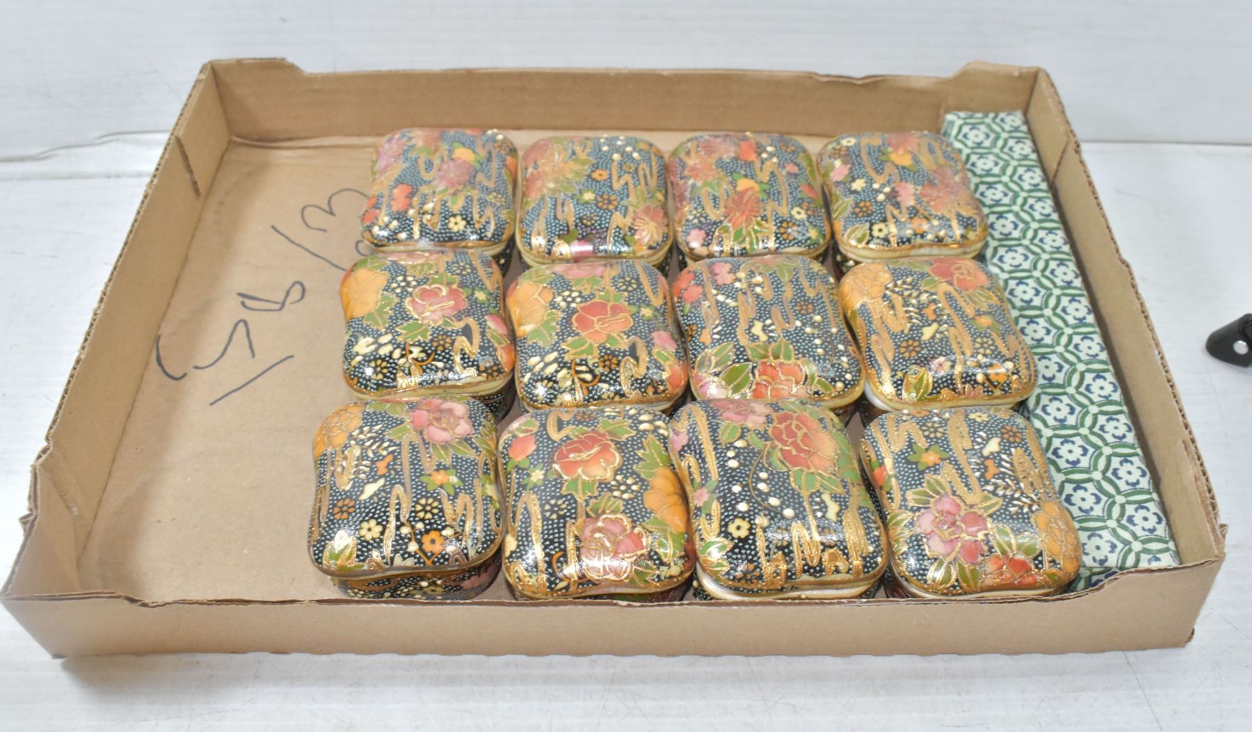 BISQUE PORCELAIN TRAINKET BOXES AND BOXED SET OF NEW CHOPSTICKS