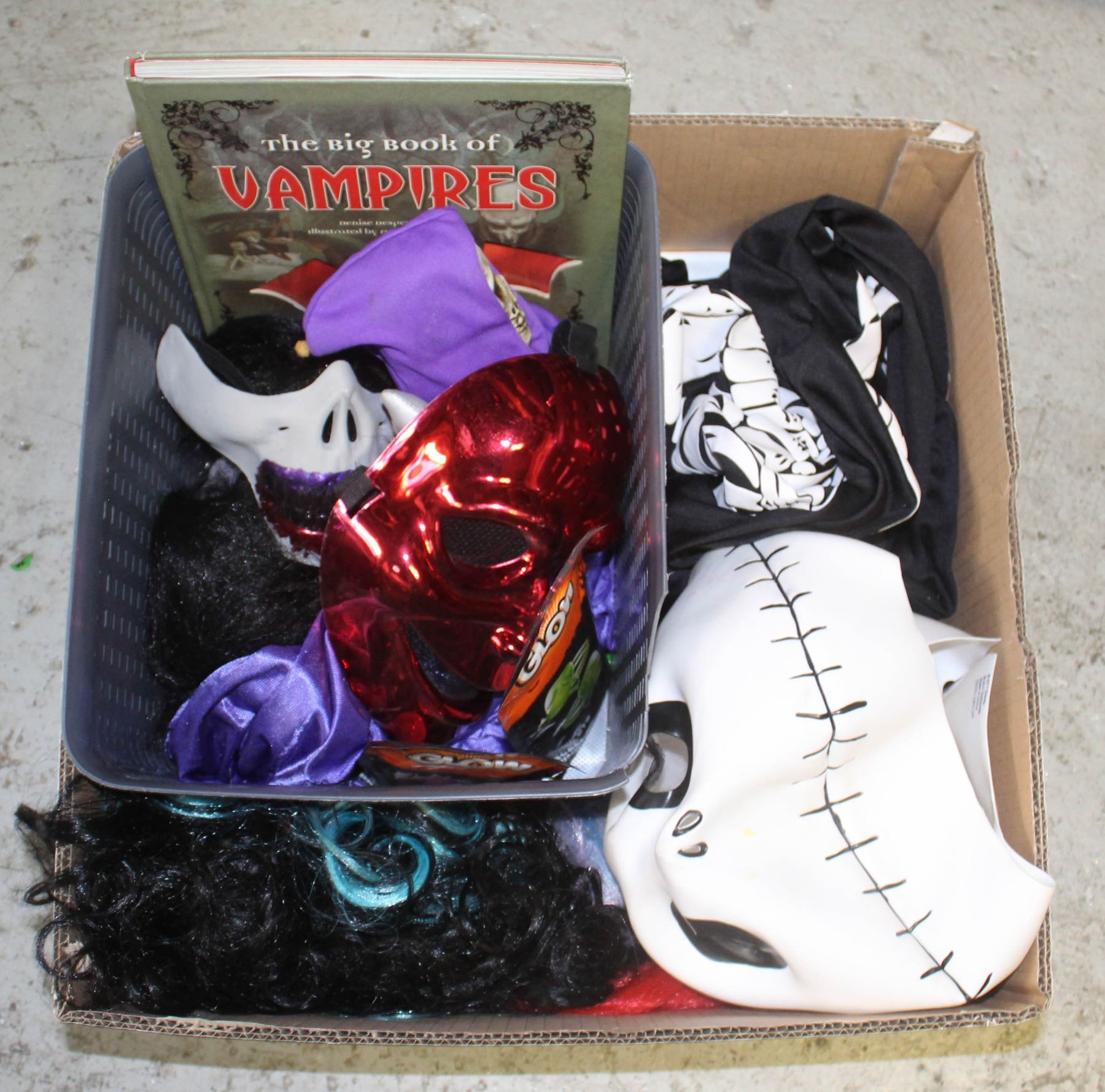 BOX OF HALLOWEEN COSTUMES, MASKS, WIGS + MORE