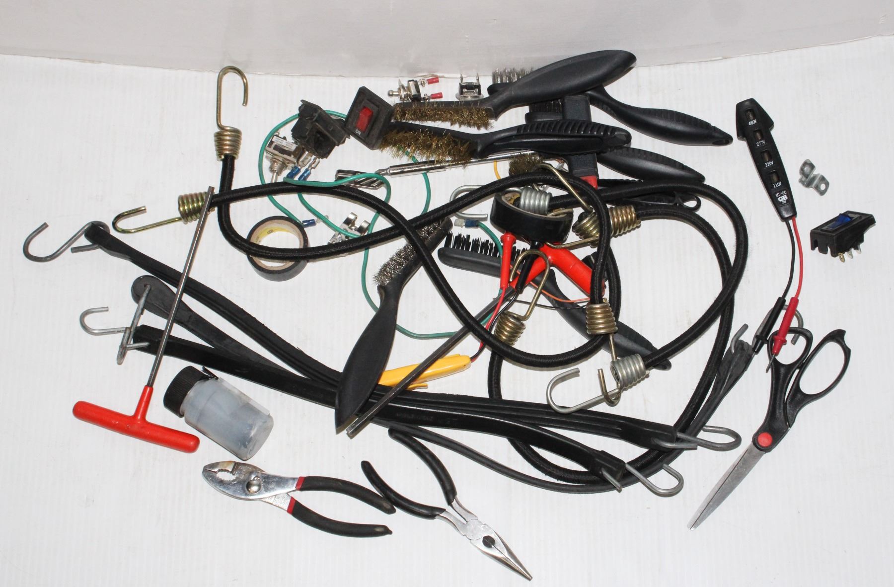 BOX OF HAND TOOLS AND BUNGEE CORDS